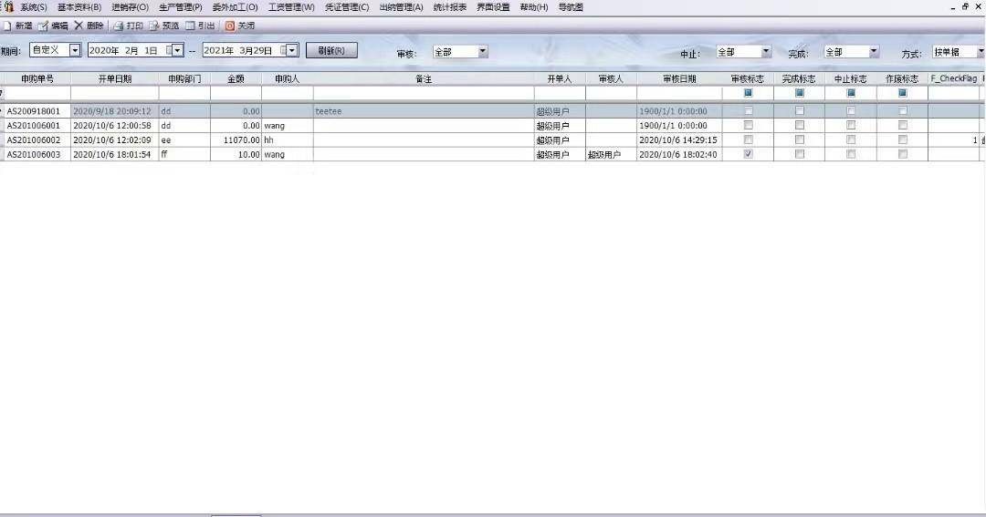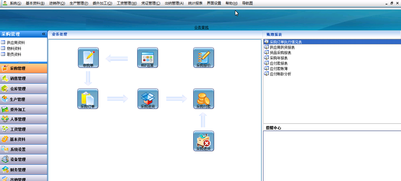 采购管理:申购单、供应商资料、物料资料、职员资料、采购报价、采购订单、采购进货、采购付款、采购退货