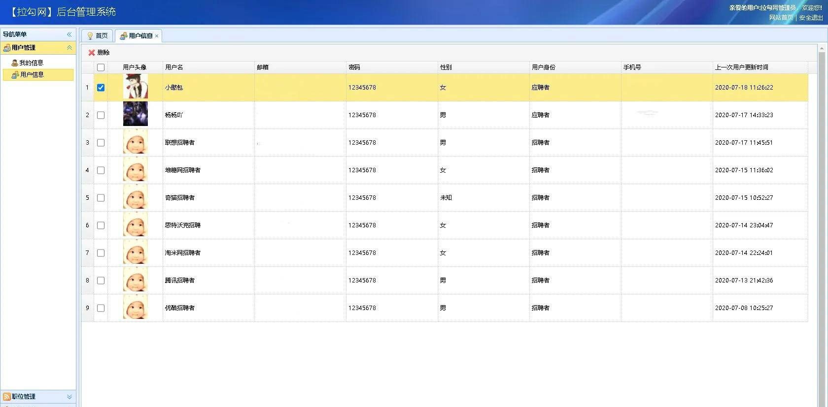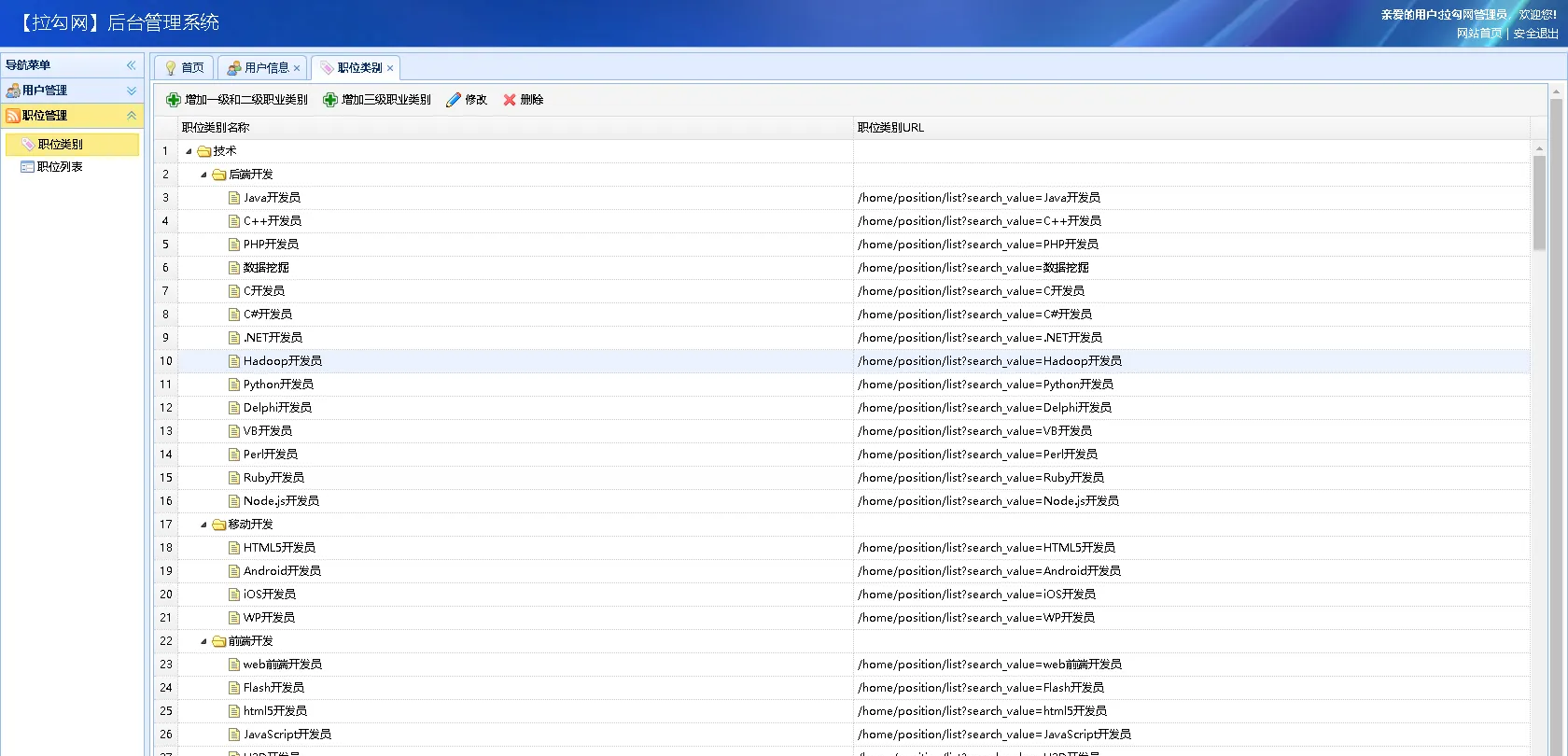 除此之外,该项目还附带后台管理功能,管理员可以登录后台管理系统,进行职位类别添加、管理用户信息、通过审核来更改公司、职位的状态等等。