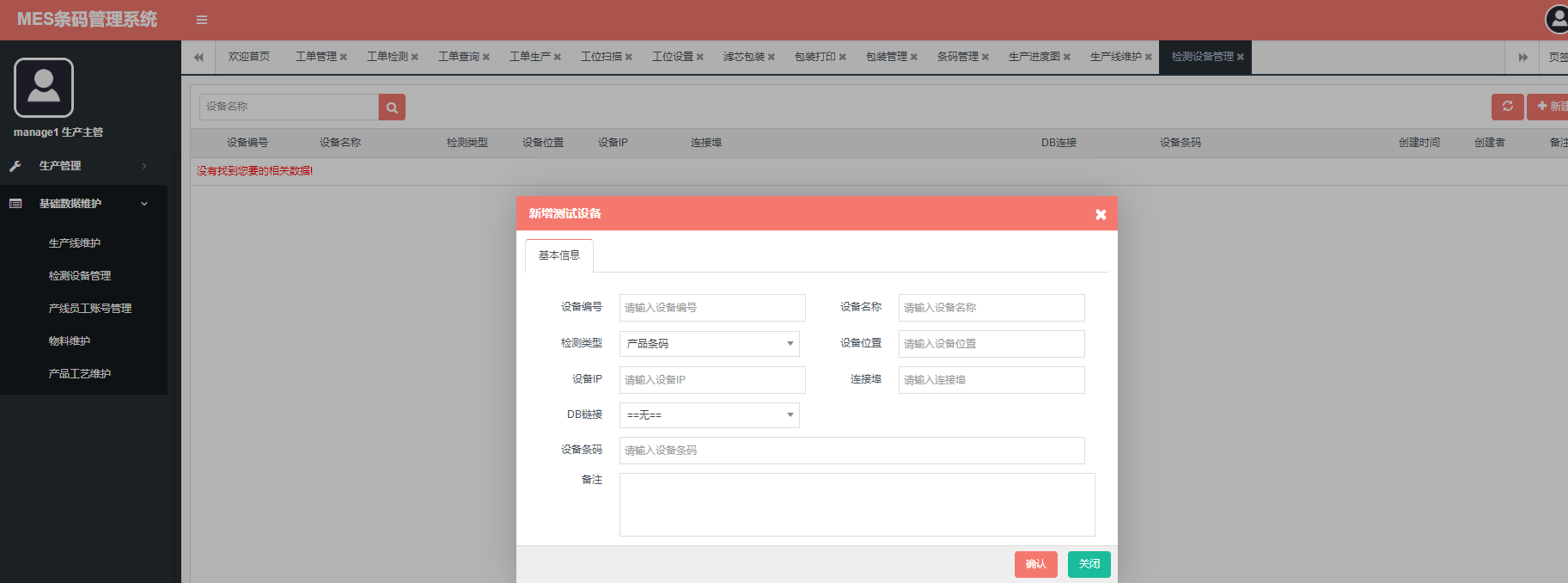 基础数据维护:生产线维护、检查设备管理、生产线员工账号管理、物料维护、产品工艺维护