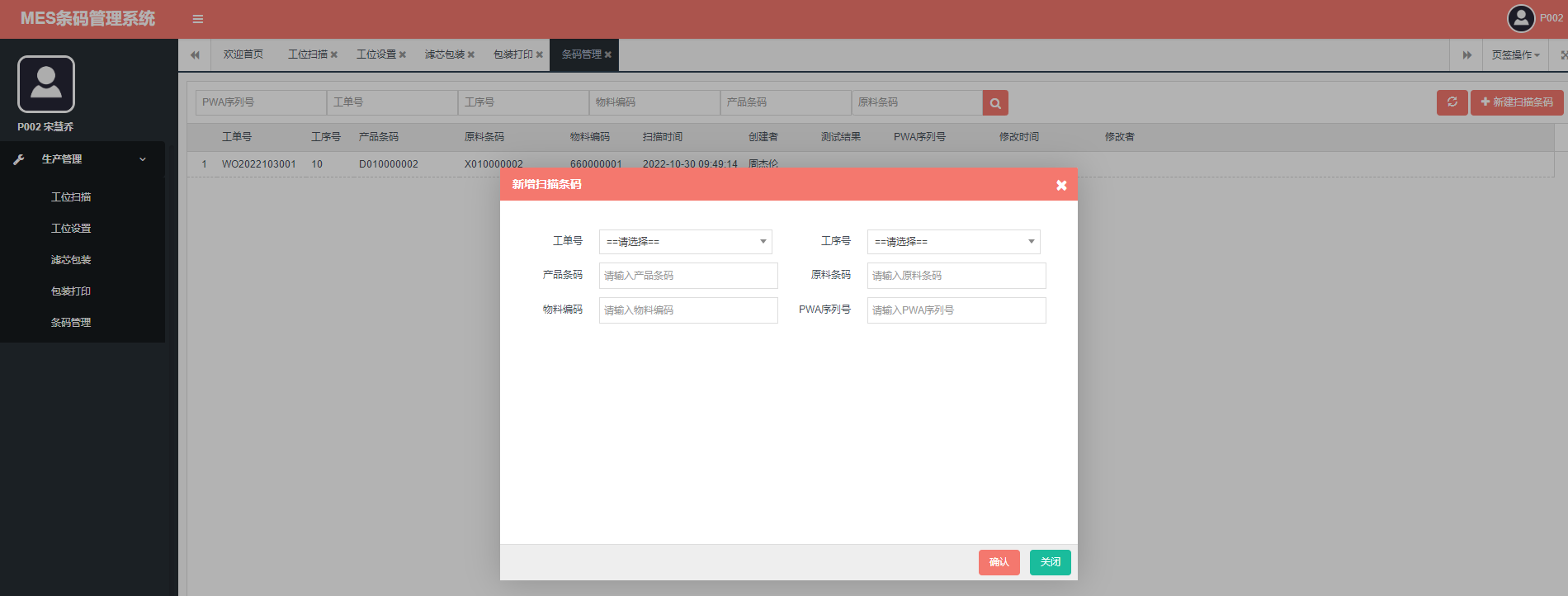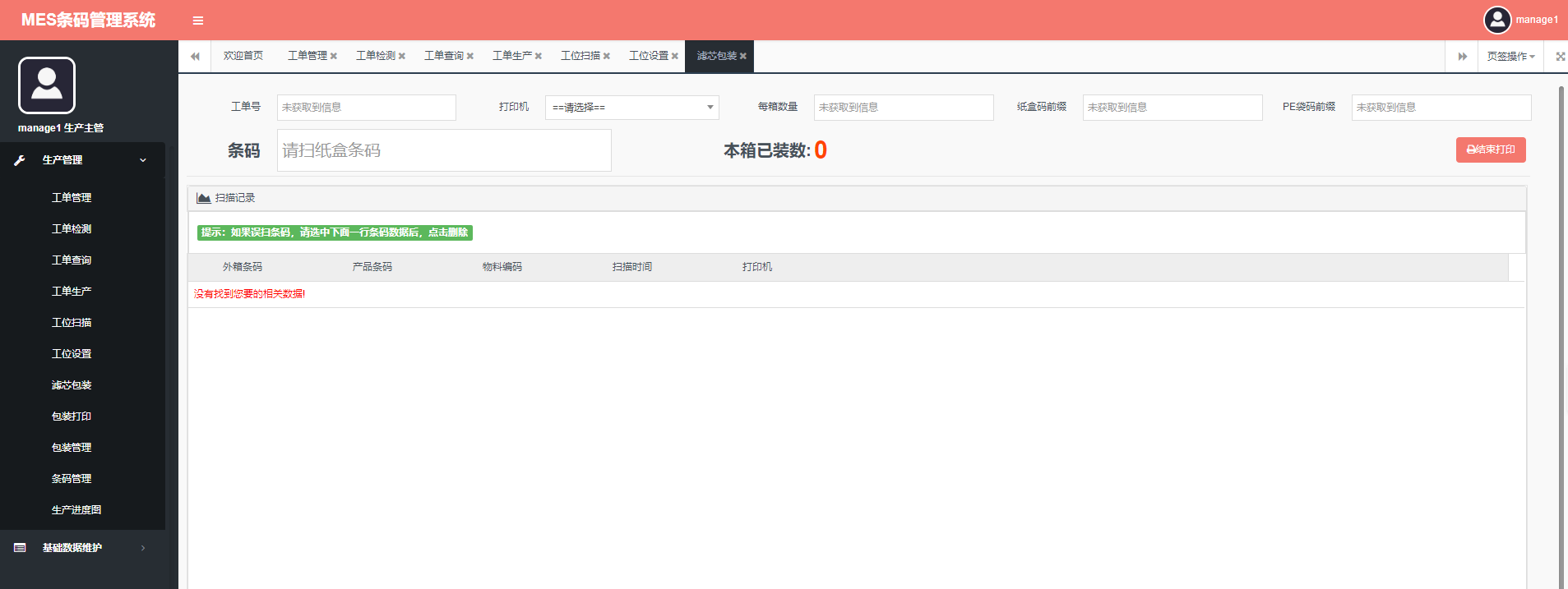 生产管理:工单管理、工单检测、工单查询、工单生产、工位扫描、工位设置、滤芯包装