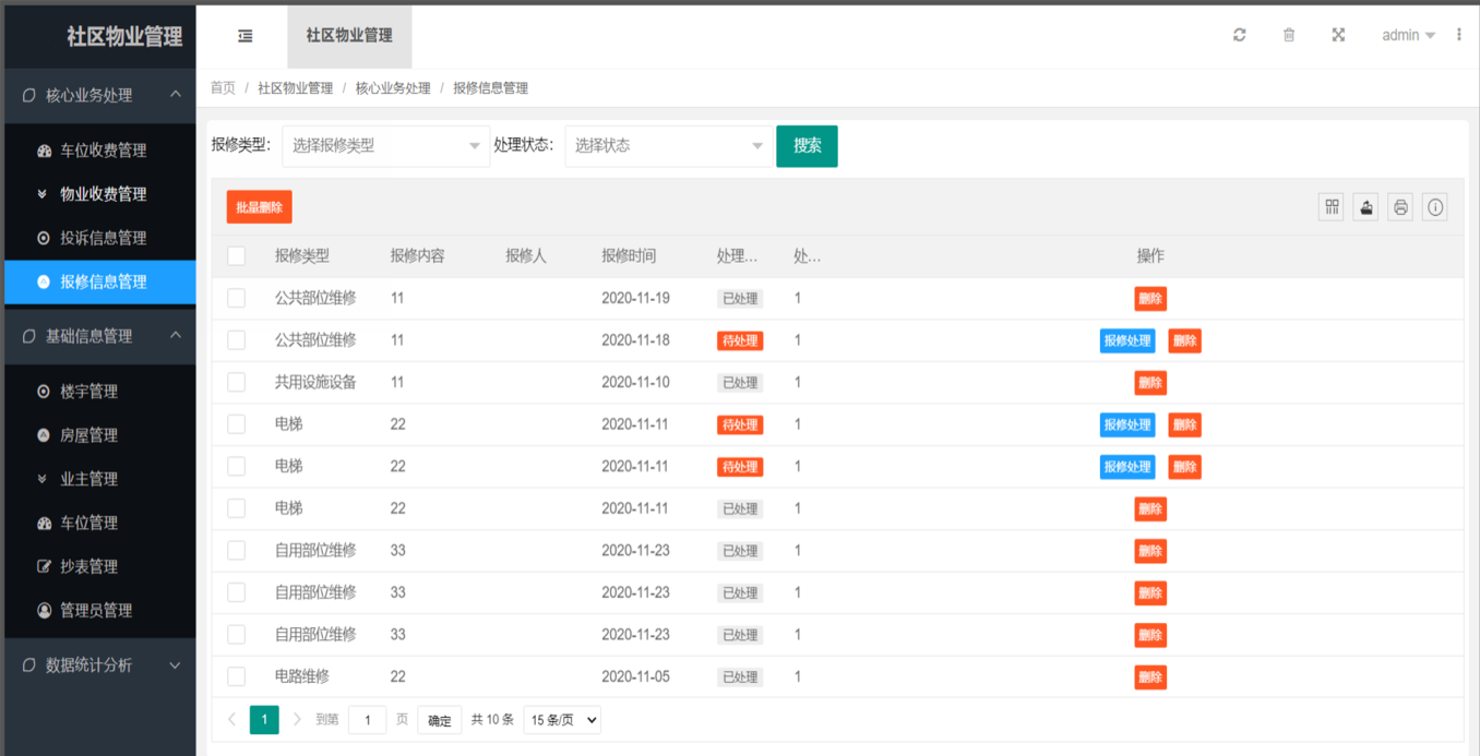 报修信息管理:报修类型、报修内容、报修人、报修时间、处理状态