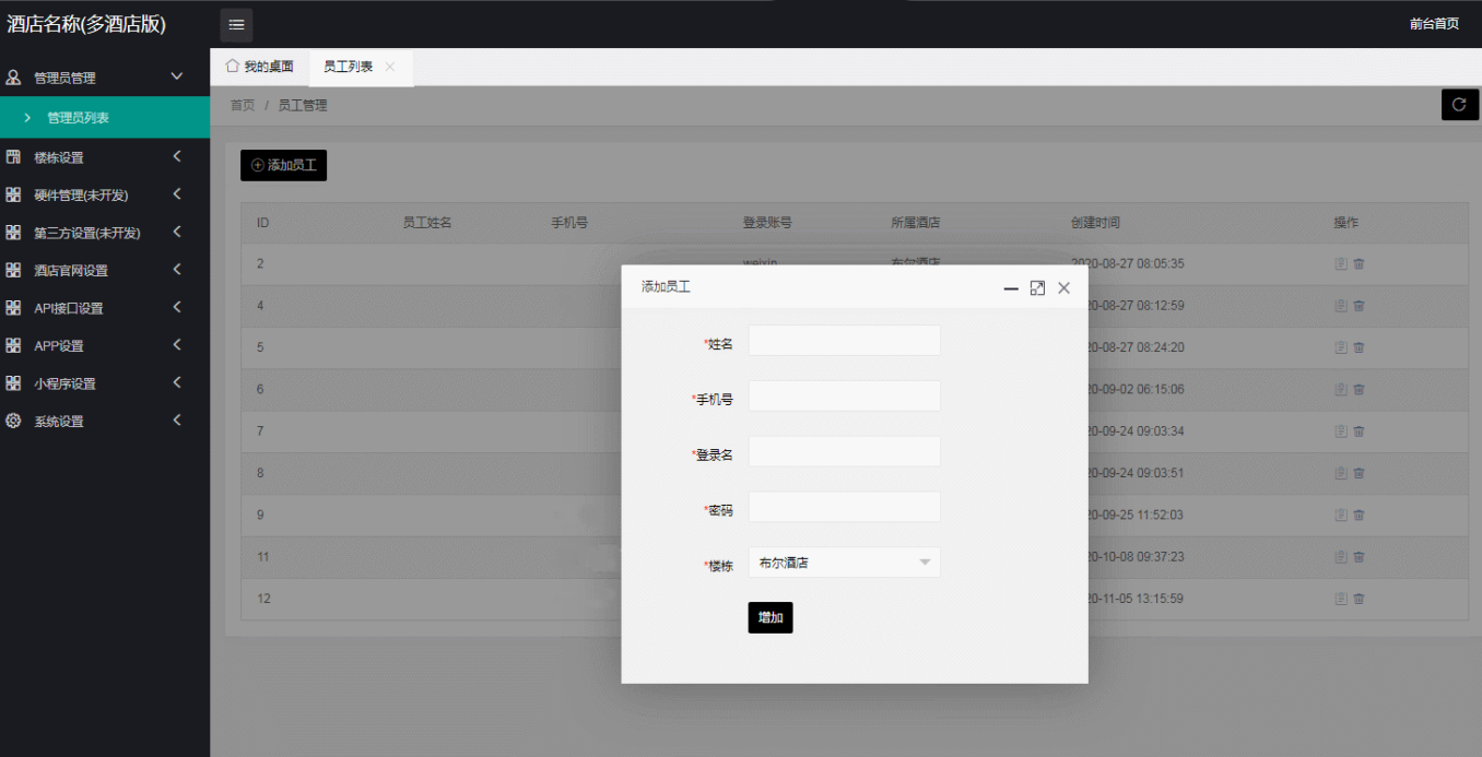 本系统是酒店管理系统(多酒店版)、️无限创建分店(想创建多少分店都可以,只有你高兴)丶入住管理 丶预订管理 丶语音提示、语音播报 丶房态实时丶图表数据 丶预警提示 丶短信营销 丶会员管理 丶商品管理 丶报表中心 丶财务管理 丶设备管理丶 ②App丶小程序丶H5丶酒店预定丶点餐丶叫服务丶店内服务 ③内部员工App。