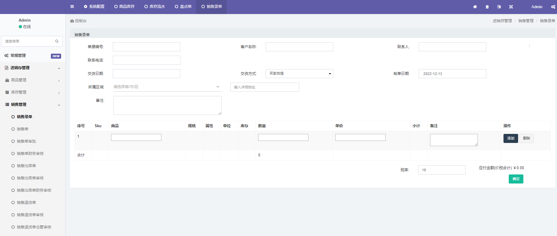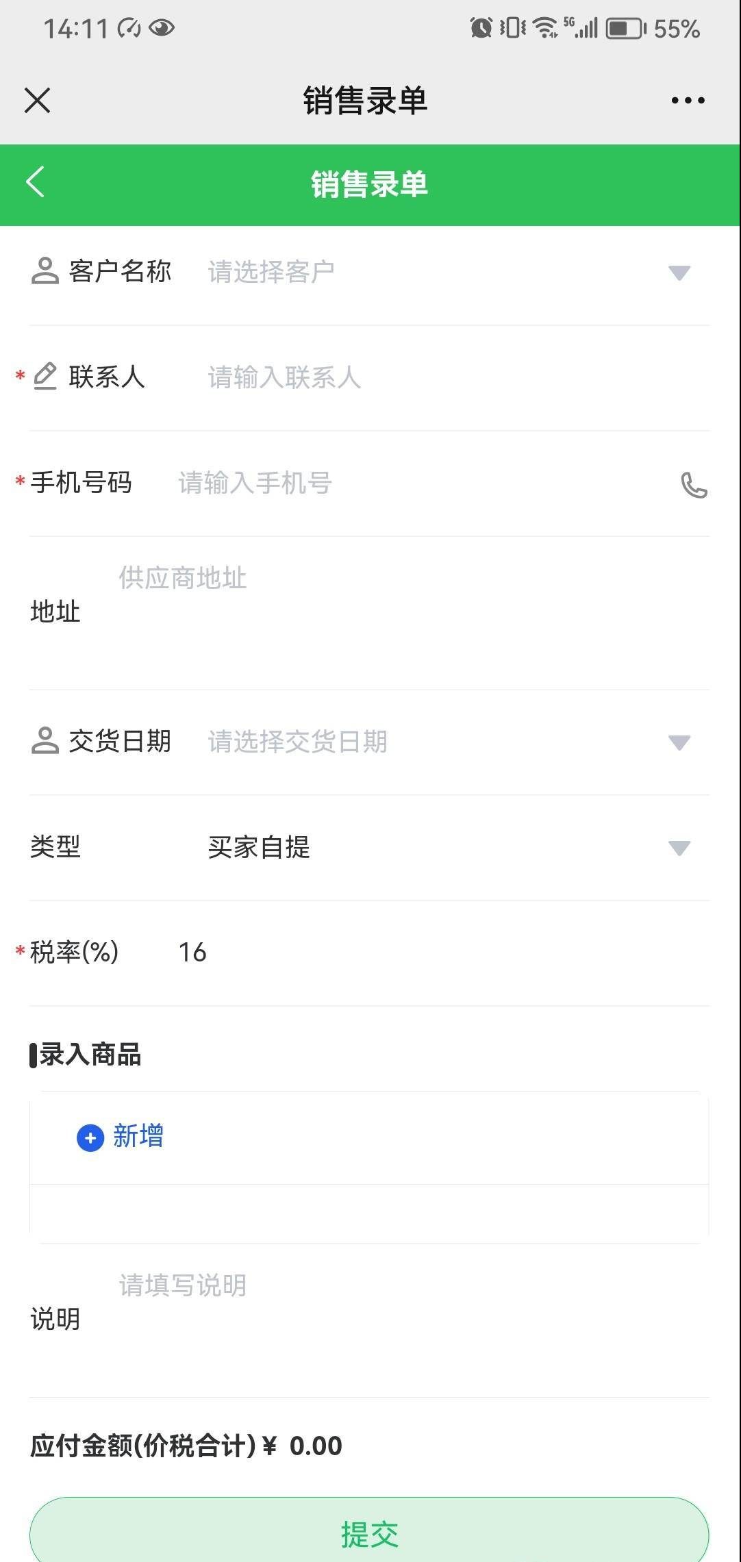 销售管理:销售录单、单据编号、客户名称、联系人、联系电话、交货日期、交货方式、制单日期