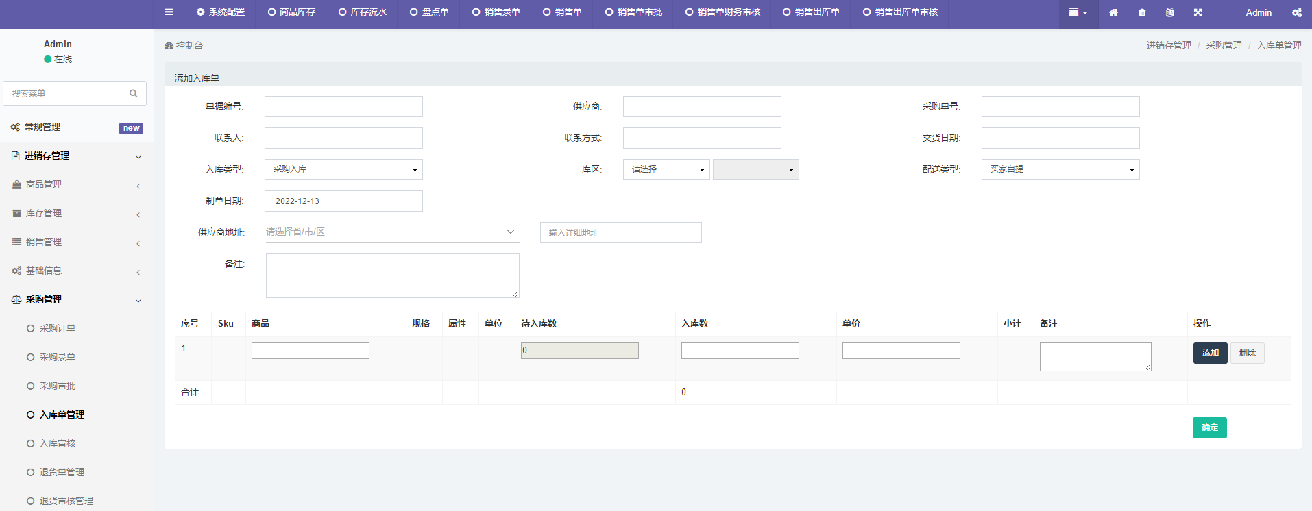 入库单管理:添加入库单、单据编号、联系人、入库类型、供应商地址、供应商、采购单号、交货日期
