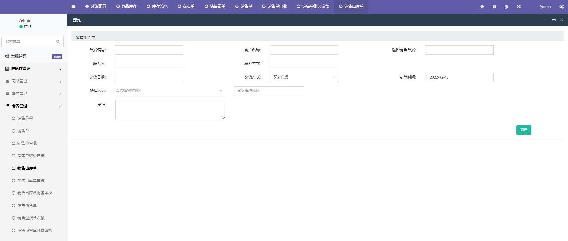 所属区域、单价、库存、销售单、销售单审批、销售单财务审核、销售出库单、销售出库单审核
