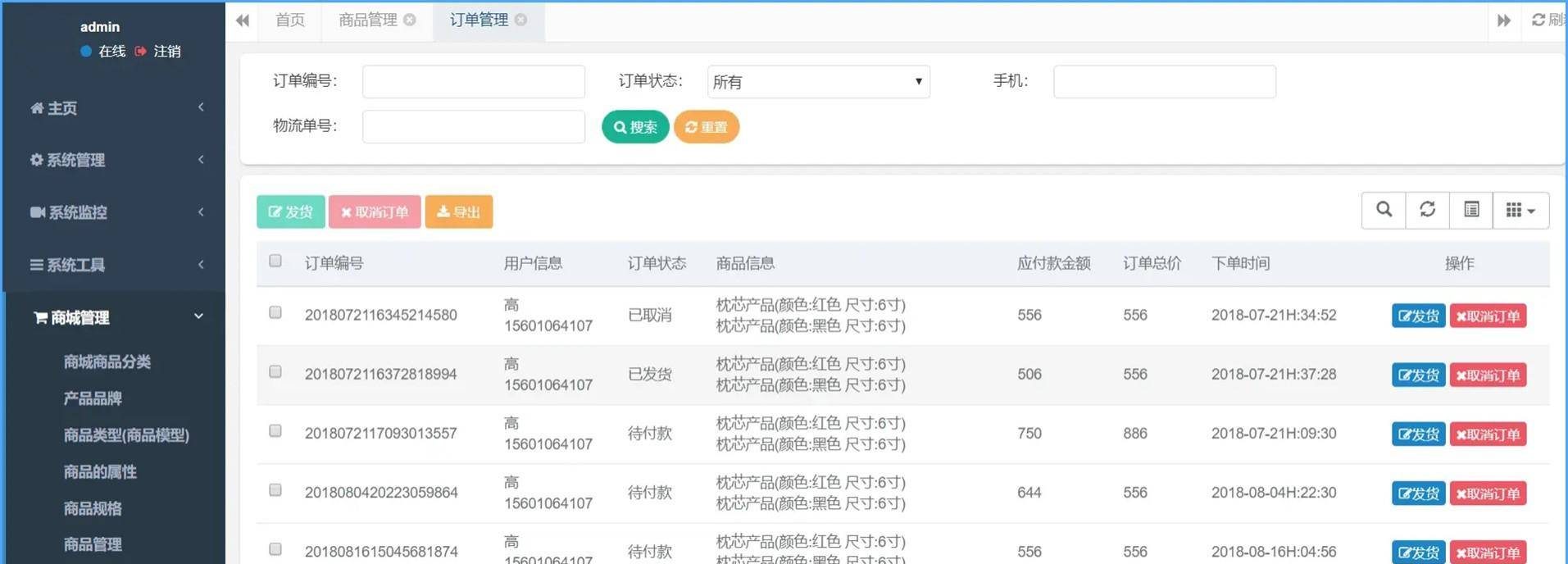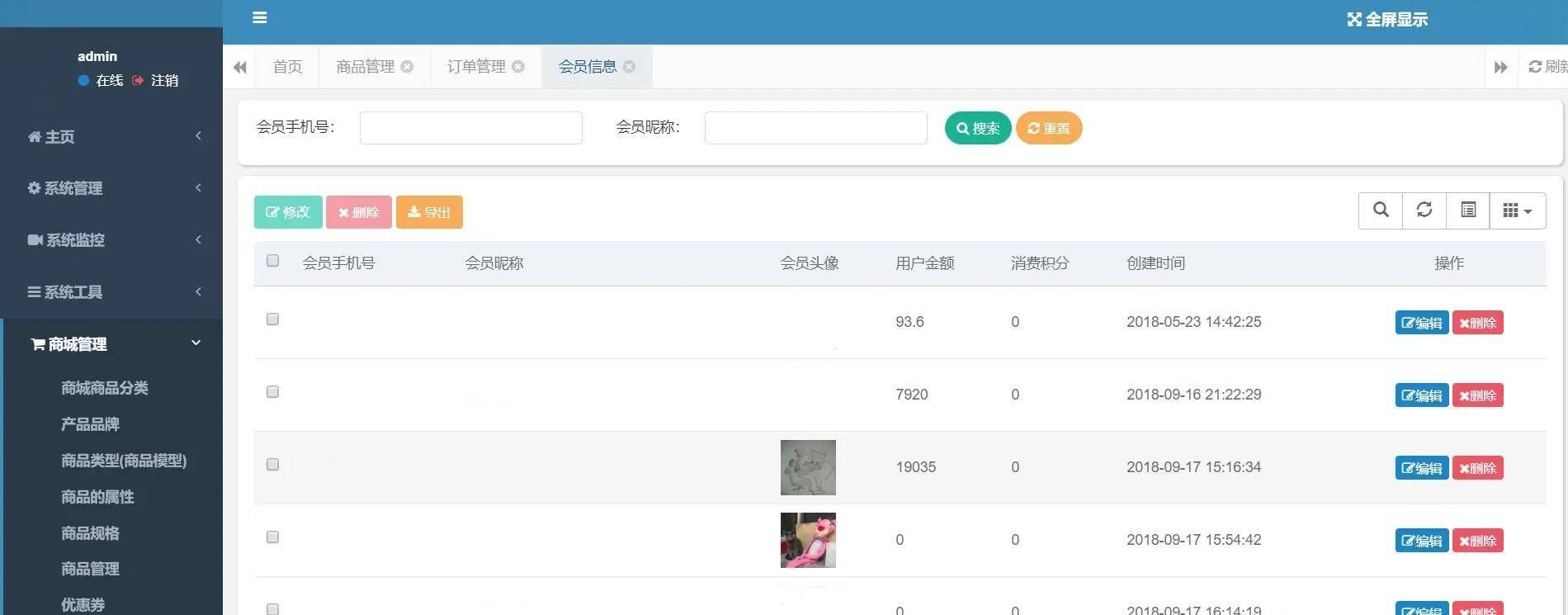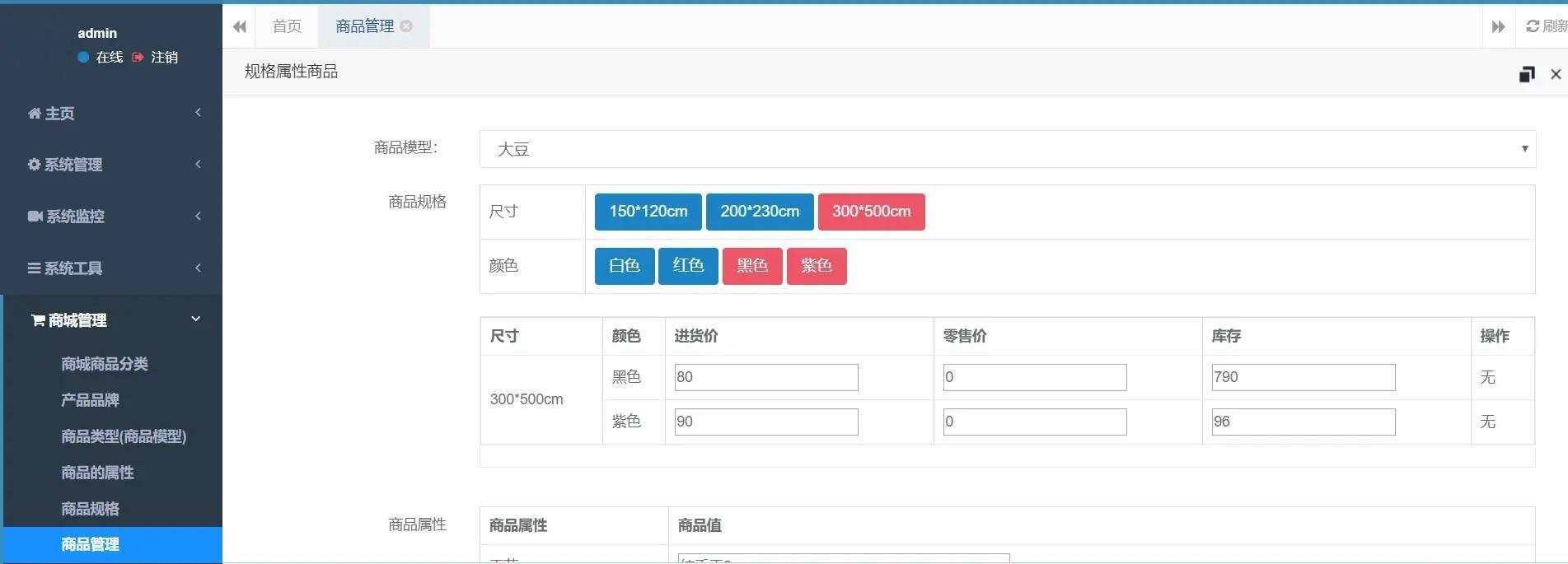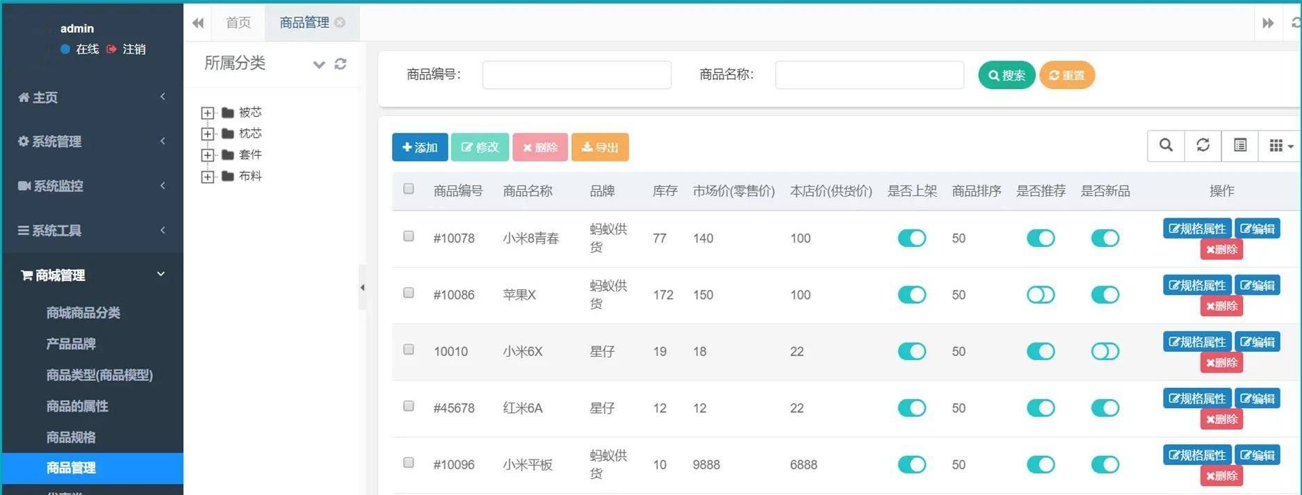 1..商城后台,完成完整的商城管理系统, 功能大概包括:商品管理,商品多规格属性管理,商品分类,商品品牌,商品订单,会员信息等等。