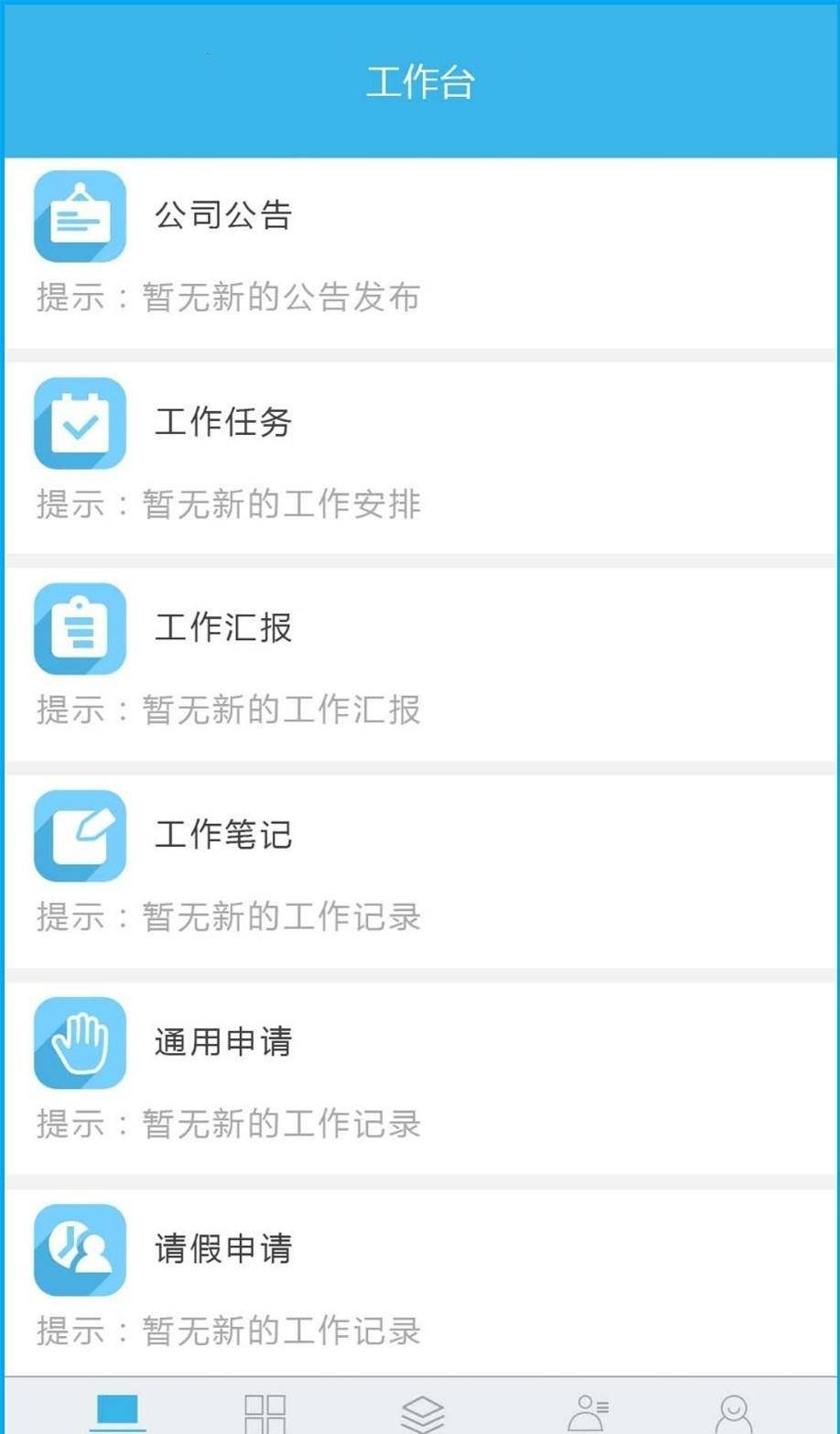 工作台:公司公告、工作任务、工作汇报、工作笔记、通用申请、请假申请