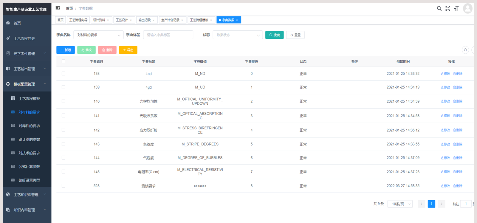 光学零件工艺设计、工艺输出记录、生产计划记录、光学零件模板、工艺流程模板