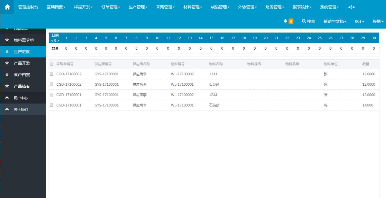 物料档案 、 物料需求单 、 采购单管理、 采购明细