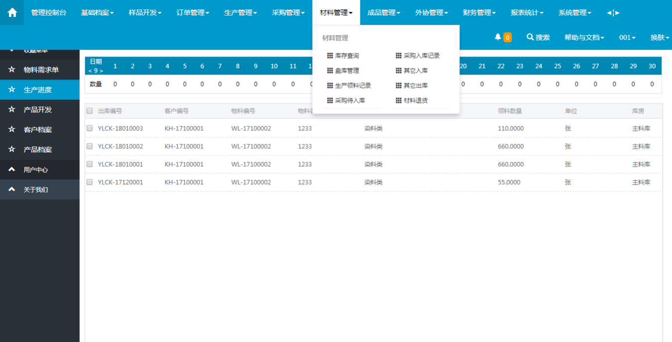 库存查询、 盘库管理 、 生产领料记录、 采购待入库