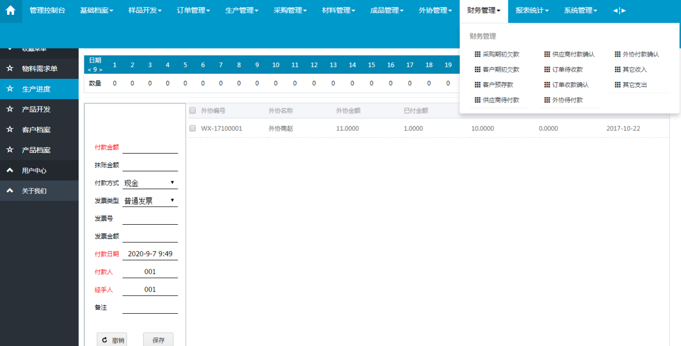 供应商付款确认 、 订单待收款 、订单收款确认 、 外协待付款、其他支出