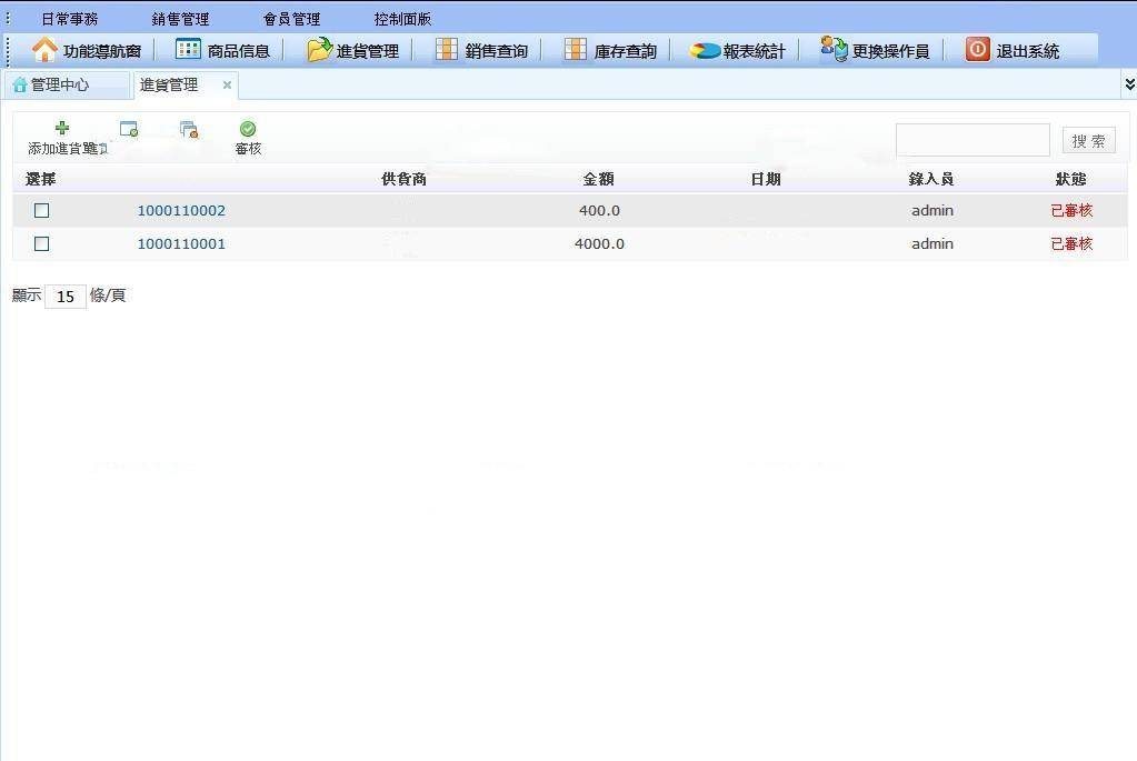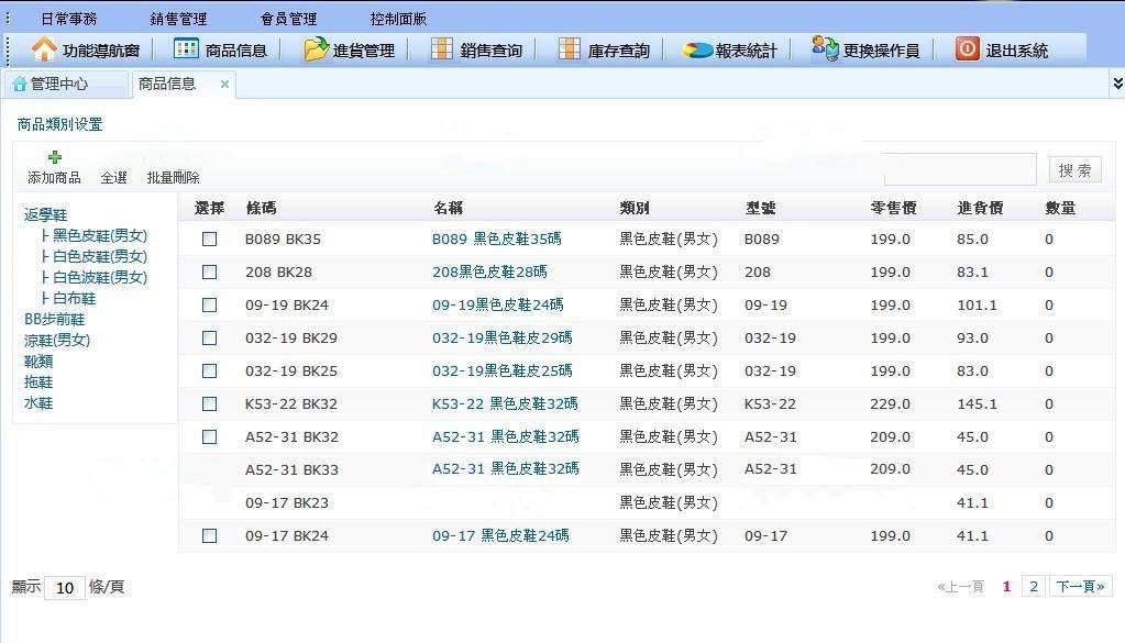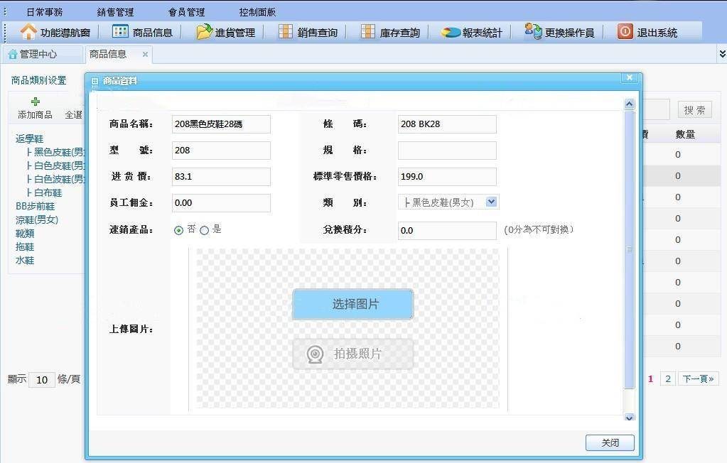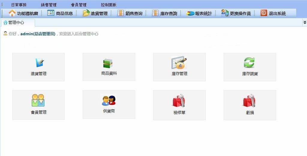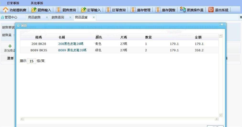 前台:銷售輸入,銷售查询,訂單輸入,訂單查询,庫存管理,庫存調整,会员管理