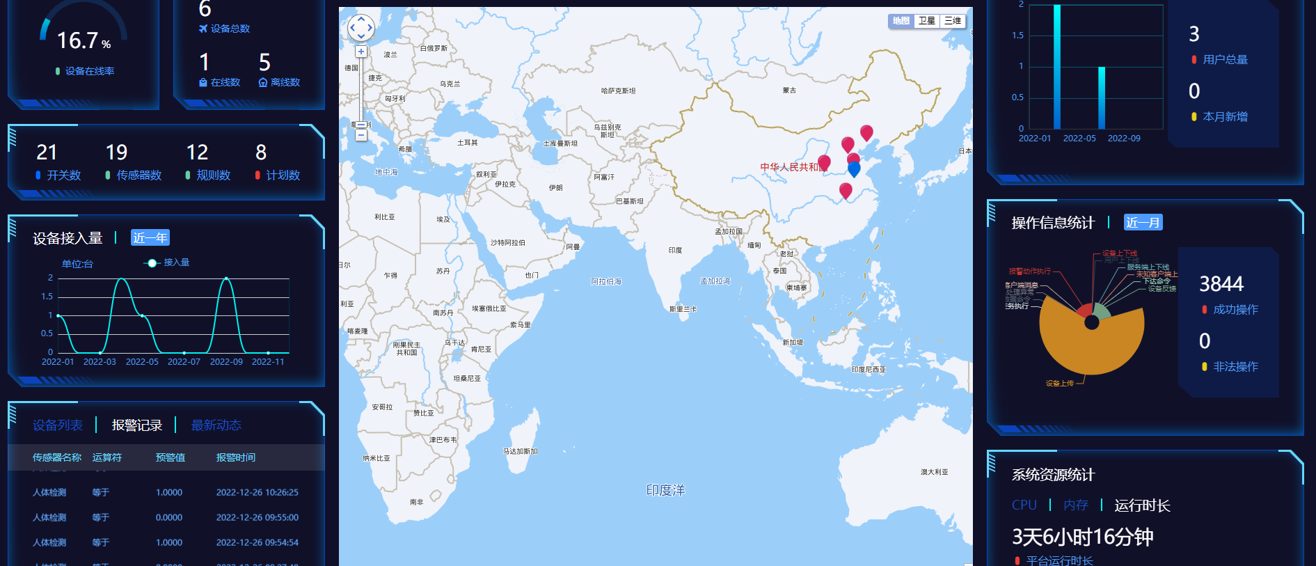 开关数、传感器数、规则数、计划数、设备接入量、设备列表、报警记录、最新动态