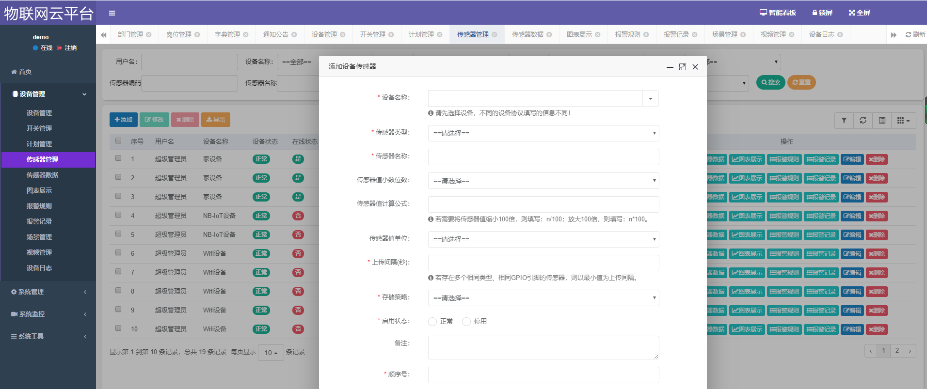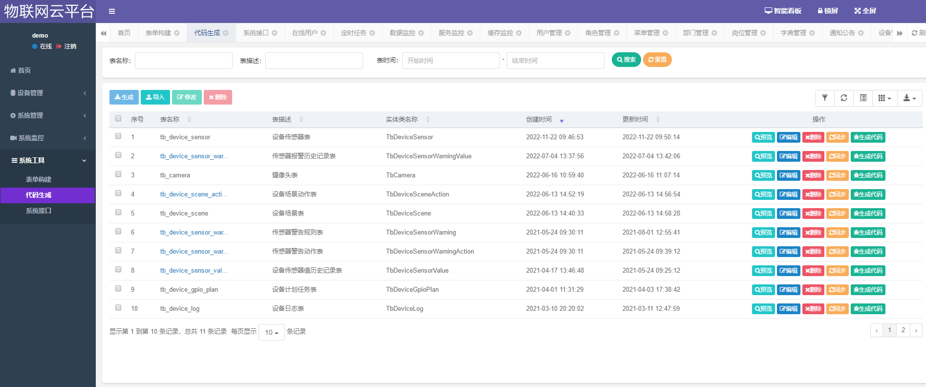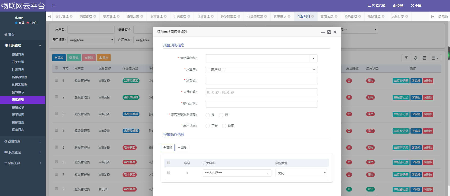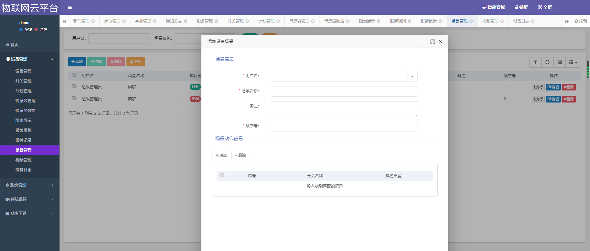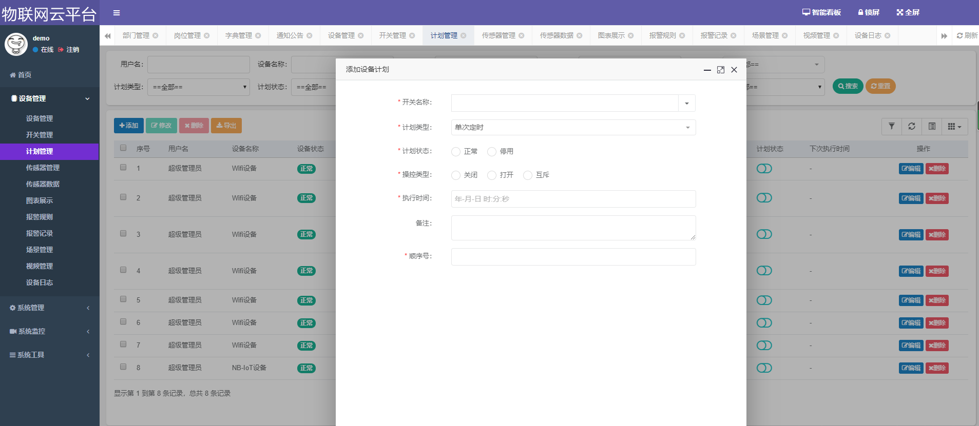 设备管理、开关管理、计划管理、传感器管理、传感器数据展示、报警规则管理、报警记录、场景管理、视频管理、设备日志、用户管理、角色管理、菜单管理、部门管理、岗位管理、字典管理、参数管理、通知公告、操作日志、登录日志、在线用户、定时任务、数据监控、服务监控、缓存监控、表单构建、代码生成、系统接口等。