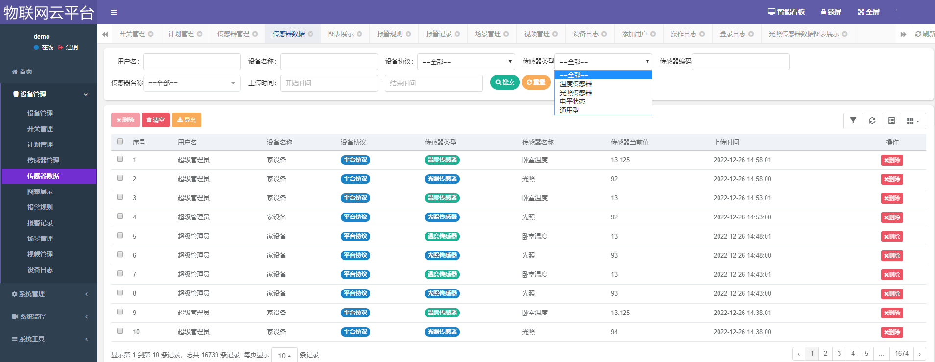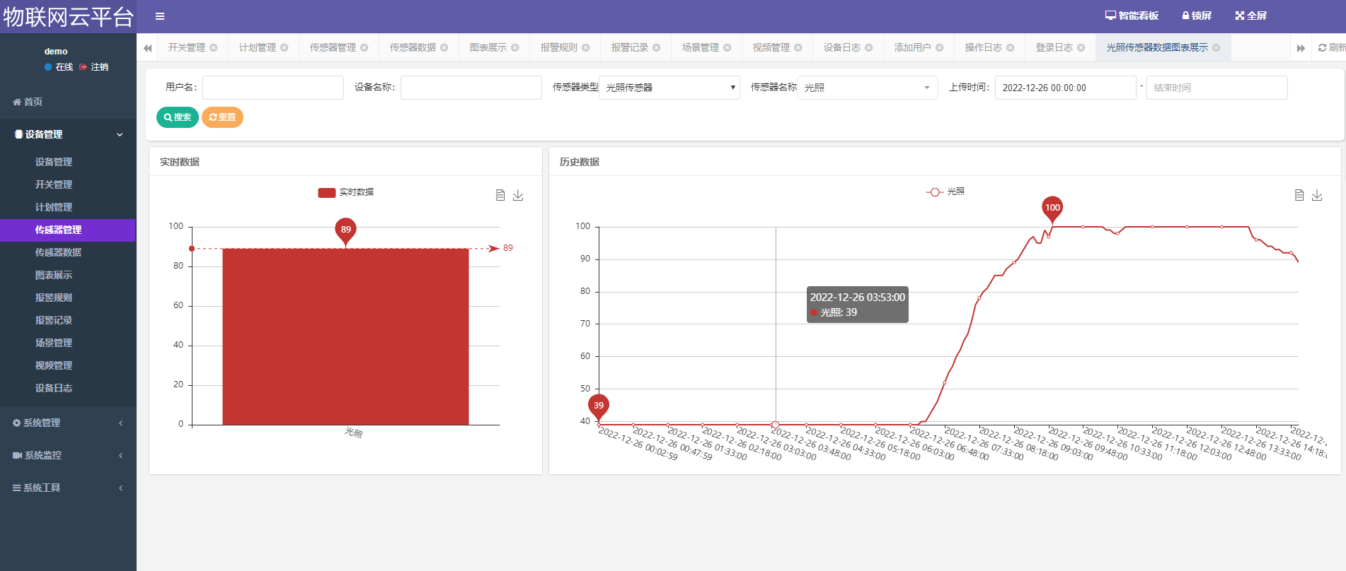 5、云平台可对各类传感器(亦可动态维护传感器类型,可适用各个业务场景。比如:温度、湿度、光照、人体感应、电压、电流、电平状态等等)管理,对传感器数据有多种展示方式。可设置阈值报警规则,符合报警规则的可执行自定义的动作、联动报警、报警通知等。