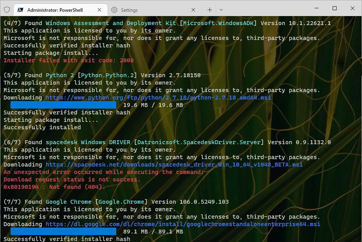 关于图 4 的其他注意事项:那里的各种元素以颜色显示。 例如,绿色文本表示可执行文件和相关包文件的名称。 红色文本表示一条错误消息。 蓝色文本显示下载文件的名称,蓝色条显示下载进度。 (因为涉及的 winget 命令已经完成,所有那些进度条也已完成。)所有这些文本和视觉元素都反映了正在使用的配色方案。 这也受到用户操纵的影响。 它可以逐个元素出现,或者用户可以选择整个配色方案,为 Windows 终端在运行时识别的多种文本项目分配颜色集。