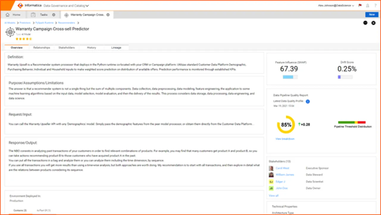 从实际角度来看,数据管理员或其他专业人员可以使用 Informatica 的 AI Governance Metamodel 查看模型和访问信息,包括定义、输入/输出文档、语义关系、特征内容和相关标签、所有权信息、变更管理和数据流 .