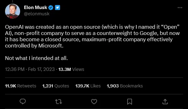 然而,马斯克在 2023 年 2 月改变了态度,他公开批评 OpenAI 成为一家与微软勾结的“闭源、利润最大化”公司。