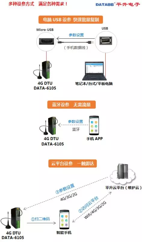 市场上大多数的DTU设备都依赖电脑和数据线来调整参数。然而,平升的DTU模块却采用了不同的方式。它兼容蓝牙和云平台进行参数设置,使得用户只需一部手机就能轻松完成参数的配置。