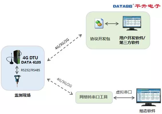 平升DTU设备在设计中特别强调与上位机软件对接的便捷性。在获取现场监测数据这一环节,该设备充分考虑到用户需求,提供了两种对接方式:一是协议开发包,二是网络转串口工具。