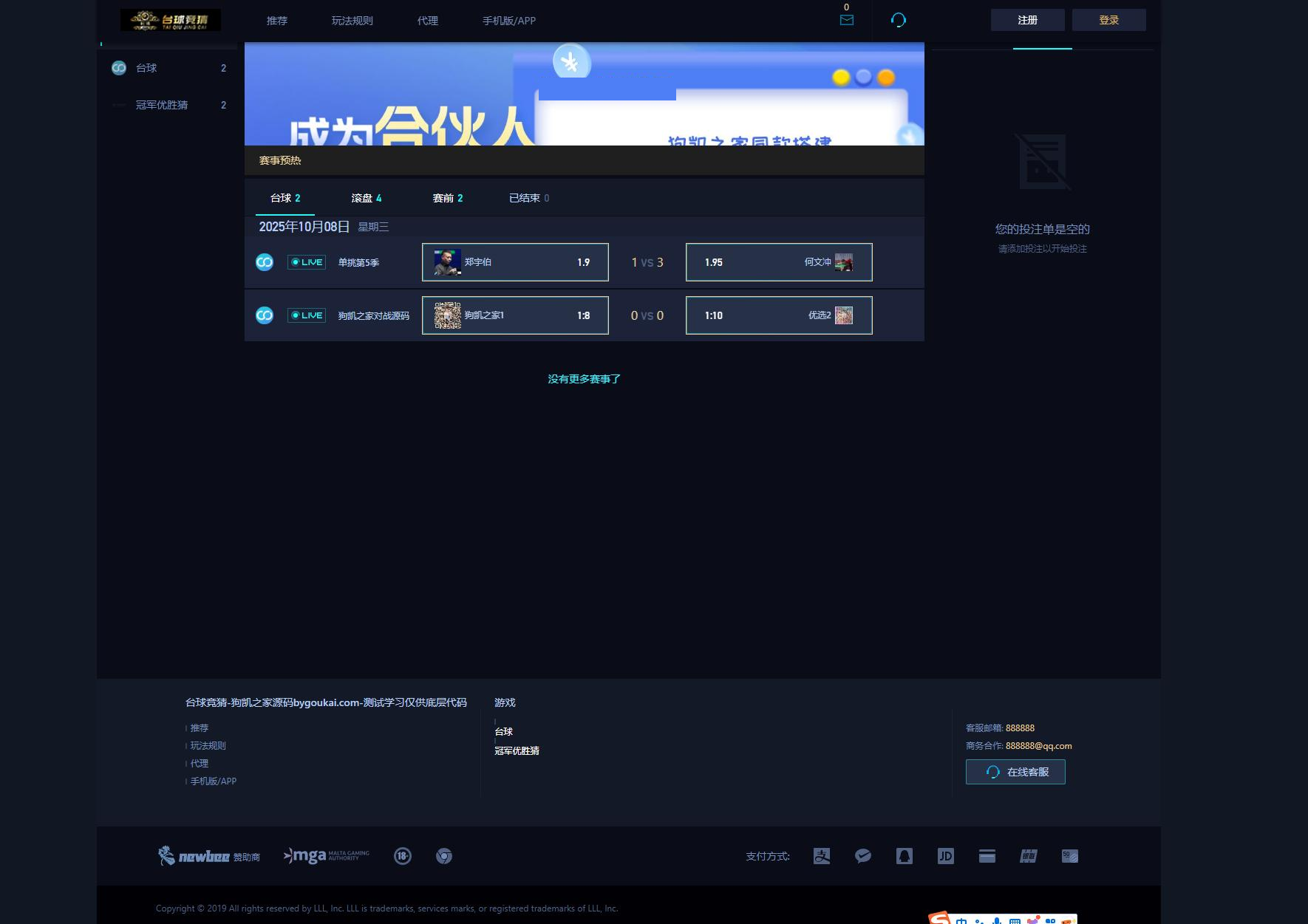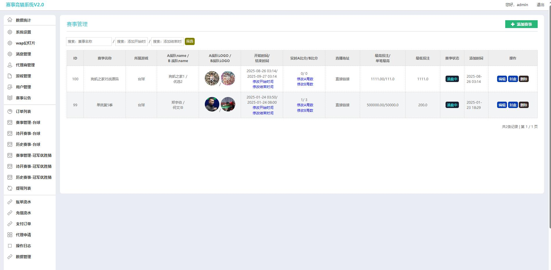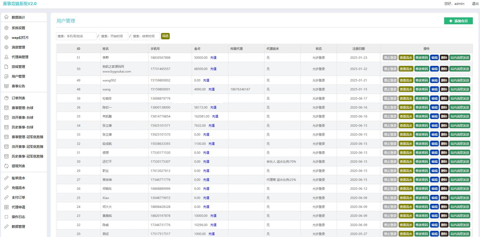 这个还行,我测试看如果修改密码后台就会少些系统设置,这个具体你们自己看看什么原因 我没时间看了,赛事自定义设置,也有冠军赛事,自定义赔率, 本来是卖的,想了下放给会员当福利吧,里面的支付配置分别在wx和Alipay 如果不想对接就设置维护客服在线充值,客服后台可以自定义代码