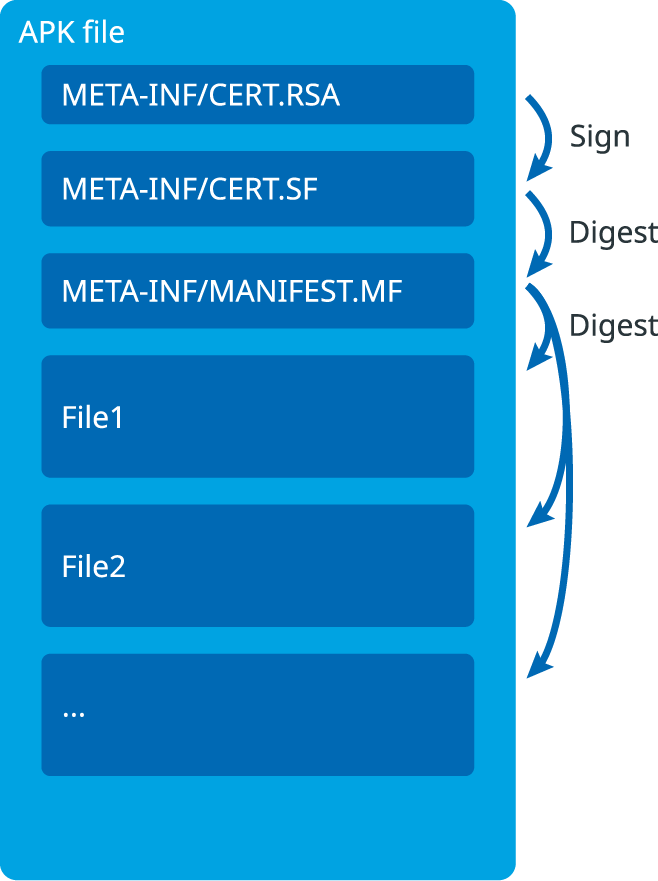 在进行v1签名校验时,系统会对jar文件内的每个文件执行摘要计算,这一过程利用特定算法生成文件的独有标识。以大型安卓开发项目为例,开发团队会对自己的APK文件执行严格的v1签名校验。他们会将计算出的摘要与已保存的摘要进行对比,以判断文件是否发生更改。此外,系统还会对文件中的各项内容进行摘要计算,并将结果与签名文件中的对应项进行比对。尽管如此,v1签名存在缺陷,比如它不会校验META-INF目录下的文件,这可能导致一些中小型开发公司面临安全风险。