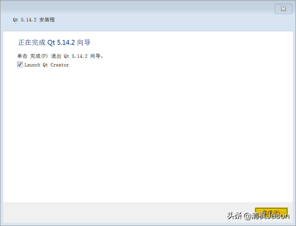 向导窗口已经弹出,只需轻点【完成】按钮,安装过程便告结束。若在安装前勾选了【Qt】,安装完毕后,Qt将自动启动。此外,安装结束后,在指定路径下会生成若干目录与文件,它们是Qt运行不可或缺的基础。