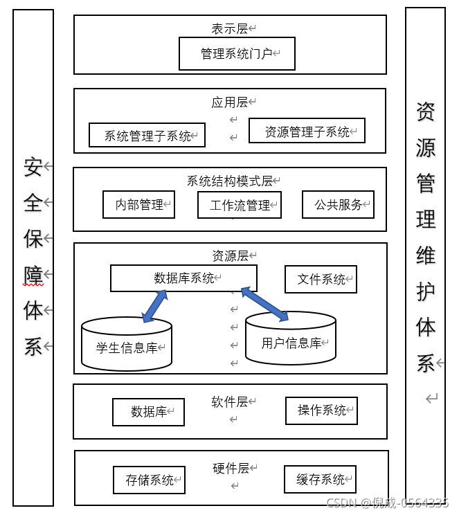 学生信息管理系统体系结构分为一个平台(IT基础设施平台),两个体系(安全保障体系、资源管理维护体系)和四个层次(资源管理层、应用支撑层、业务应用层和表现层)。具体构成如图6-1所示。