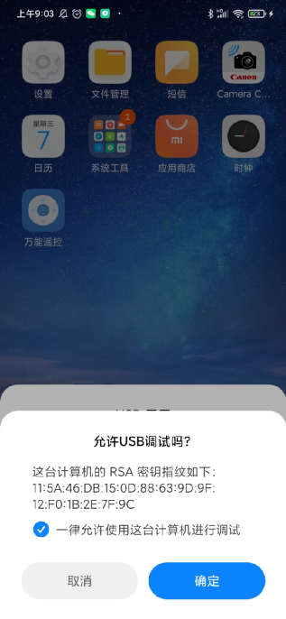 手机与电脑首次连接调试时,会出现一个确认框,询问是否允许该电脑进行调试。通常情况下,这一过程运行顺畅。然而,偶尔也会遭遇一些问题。