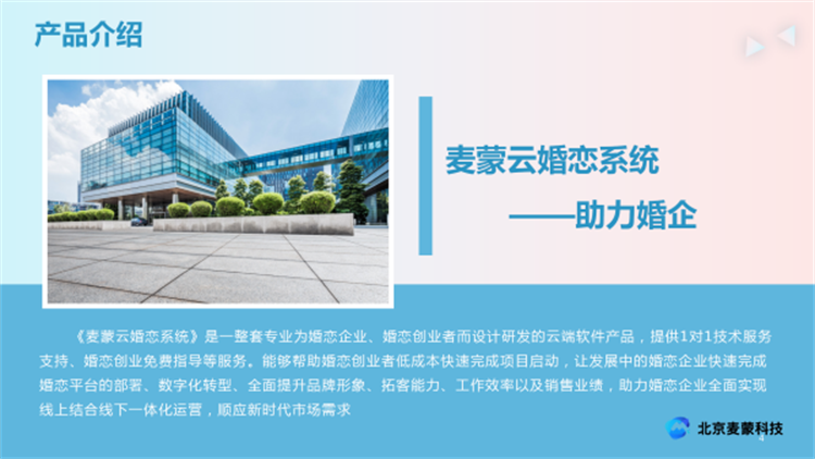 北京麦蒙科技在云婚恋系统开发上具有显著优势。这样的优势在于,它能让创业者以较低的成本启动项目。为何成本低?那是因为它提供了一站式的服务,创业者无需对接多个环节,这样就能节省不少资源。