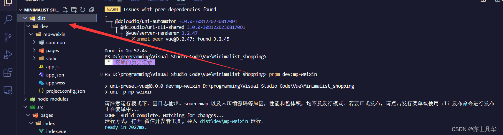 编译微信小程序,必须使用pnpmdev:mp命令。使用此命令后,会生成名为dist的文件夹,其中包含微信小程序运行所需的所有必要文件。在公司进行uni-app项目转换时,这一步骤是必不可少的。