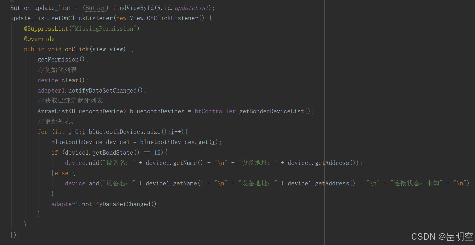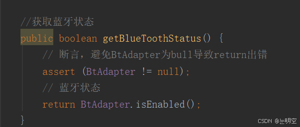 实现蓝牙功能需知晓其现状,以便辨别蓝牙是开启还是关闭。同时,我们还能查阅所有已配对的蓝牙设备列表。