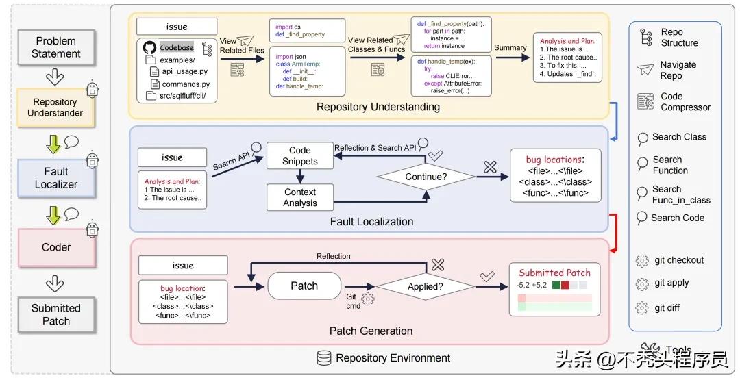 故障定位器在故障定位环节是必不可少的,它就像医生的诊断工具一样。软件一旦出现问题,准确找出故障点至关重要。比如,某图像编辑软件曾出现色彩显示异常,开发人员经过长时间搜索,最终发现是色彩转换算法代码出了问题。我们的模型在故障定位环节也要模拟开发者的复杂诊断过程,这涉及到使用工具和不断尝试解决方法。而补丁生成阶段,则是在此基础上进行最后的修复工作。