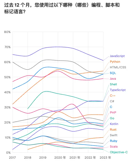 2023年,Java依旧高居最受欢迎编程语言榜首,占比达61%。在电商巨头后台,众多服务均采用Java编写。然而,我们也注意到,某些小众语言的发展态势。例如,去年,部分语言的使用率极低,甚至不到2%,但仍有程序员尝试过。Rust的发展势头值得关注,其用户群体在过去五年里持续扩大。iOS开发者在新跨平台语言出现后,部分原有语言的使用需求有所降低。这一现象表明,编程语言的市场格局持续演变。不同项目和应用场景会选择相应的编程语言,这取决于语言的特性以及开发者对其的熟悉度。不同语言的流行度此消彼长,未来是否会有新语言颠覆现有格局,令人期待。