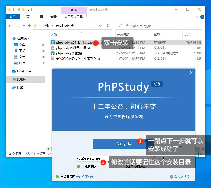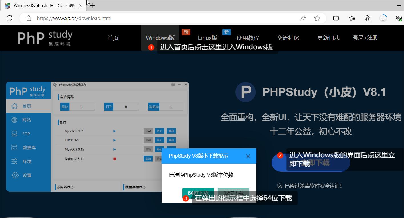 首先得选对开发环境。我们选了一个对PHP特别友好的系统和集成开发环境。得在百度上搜关键词找到官网,得留心看是不是官网的标志。得选64位的下载版,然后按照步骤一、二、三来操作。下载完得解压,随便哪个目录都行,再双击安装。安装好了,得打开软件,看MySQL和Nginx是不是都启动了。启动了,就用浏览器输入网址,看看默认站点是不是建好了,这样就能确认环境是不是装成功了。