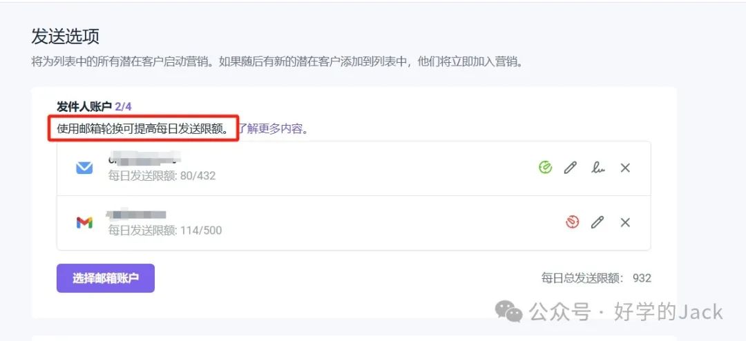 发送大量邮件时,单一个邮箱往往不够用。Snov.io设计得非常周到,能够连接多个邮箱。这样,在需要大量发送邮件时,可以轮换使用不同的邮箱。每个邮箱都有其发送额度,会自动轮换。对于众多外贸公司而言,这解决了邮件发送难题。若持续用同一邮箱发送,可能会因为限制而使邮件无法正常发送或到达率极低。而采用多个邮箱交替发送,就好比组建了一支有序的邮件发送队伍。