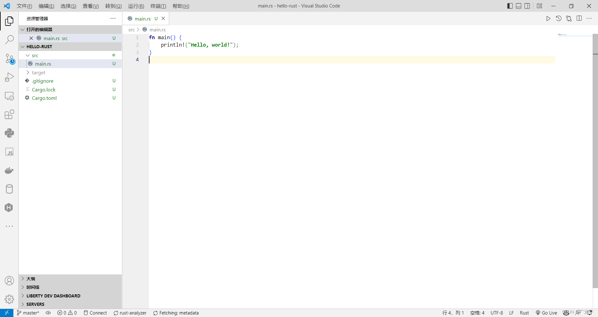 新建的项目自带“HelloWorld”示例。只需在相应终端执行“cargorun”指令,即可查看输出结果。这是一个入门级的例子,有助于初学者迅速掌握Rust编程的易用性和便捷性。