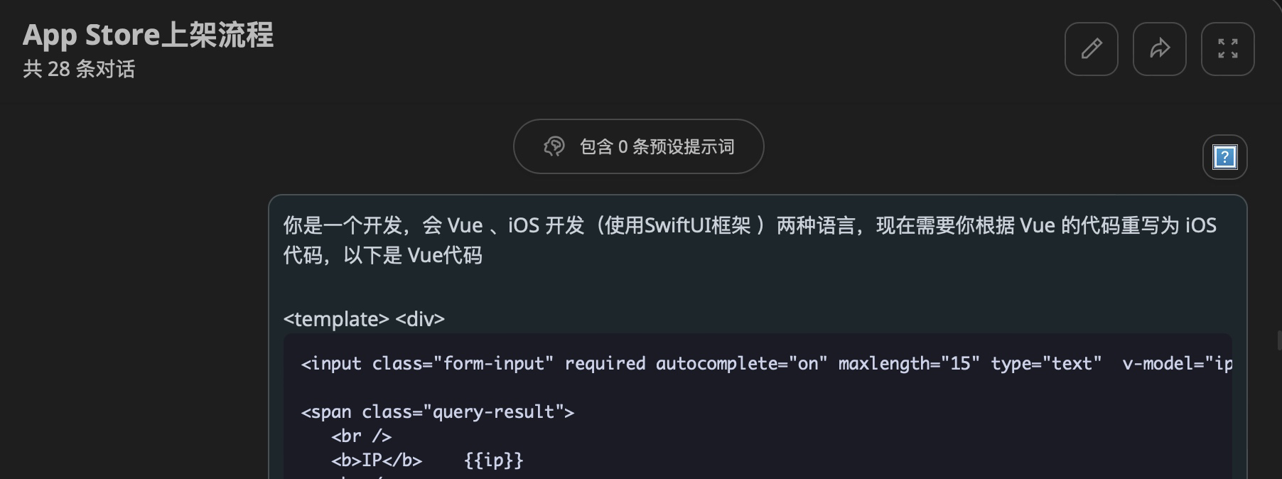 你是一个开发,会 Vue 、iOS 开发(使用 SwiftUI 框架 )两种语言,现在需要你根据 Vue 的代码重写为 iOS 代码,以下是 Vue 代码