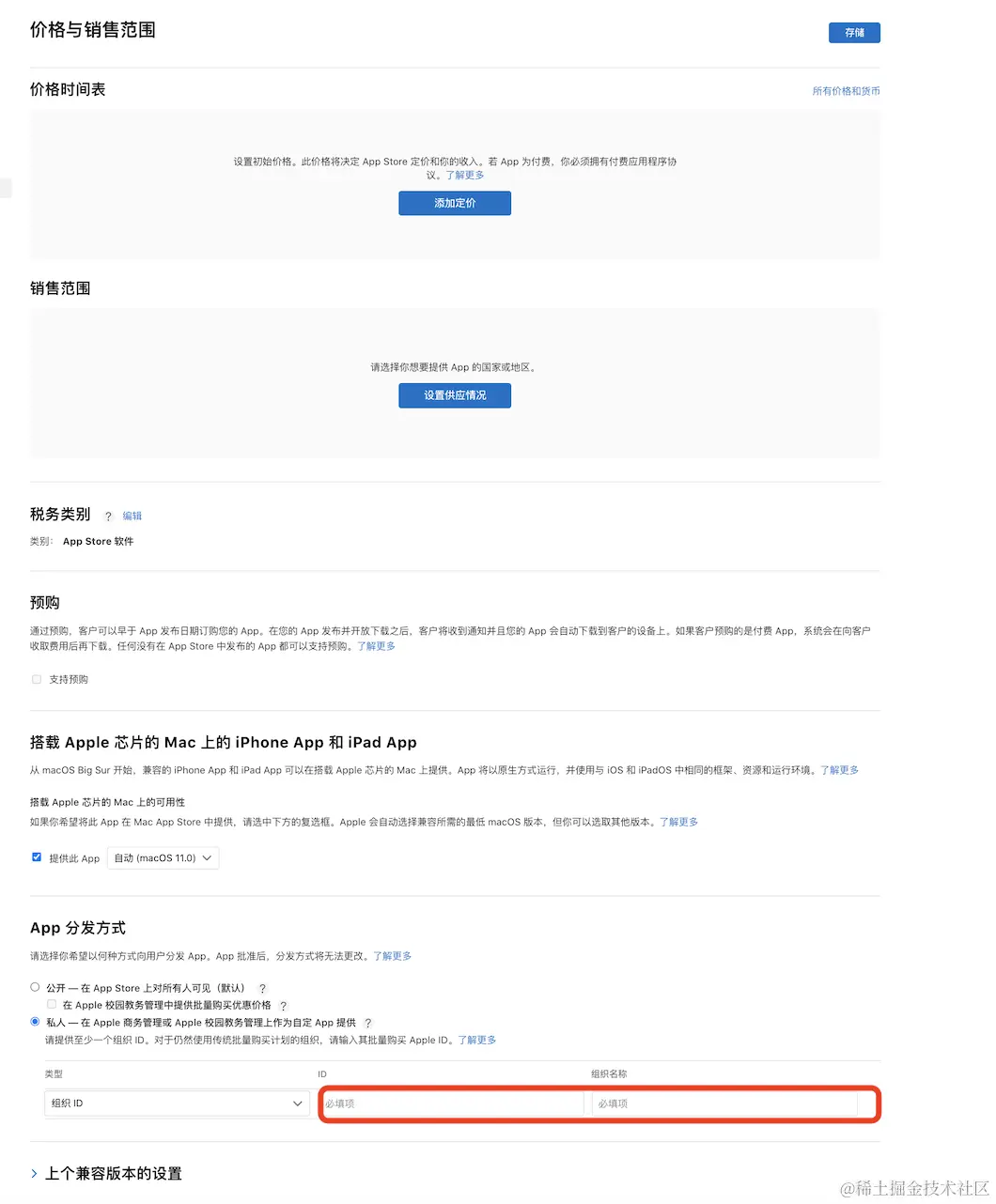 App的分发途径十分关键,务必选中“私人—在Apple商务管理…”这一选项。同时,还需准确填写注册在商务账号上的组织名称和组织ID。举例来说,在我们进行企业内部App的重要分发过程中,若这一环节出现遗漏或错误,整个分发方案将即刻失效。