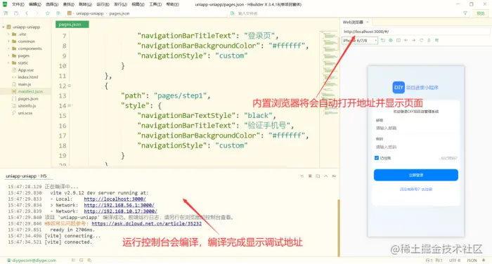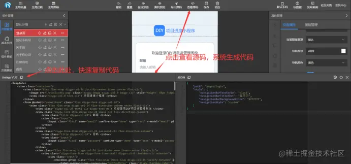 工具栏区域支持代码的查看与导出等操作。浏览源码可查看当前页面的代码,便于用户迅速将代码复制至现有项目替换或用于新建页面开发。导出源码需输入应用标识,导出的代码不自带uni-app插件,使用时需提示安装。此外,在保存修改工程源码时,右侧浏览器内容可自动更新。这些功能为开发者提供了在不同开发环境下的便利。对于小型项目,只需复制部分代码即可复用,大大简化了操作流程。