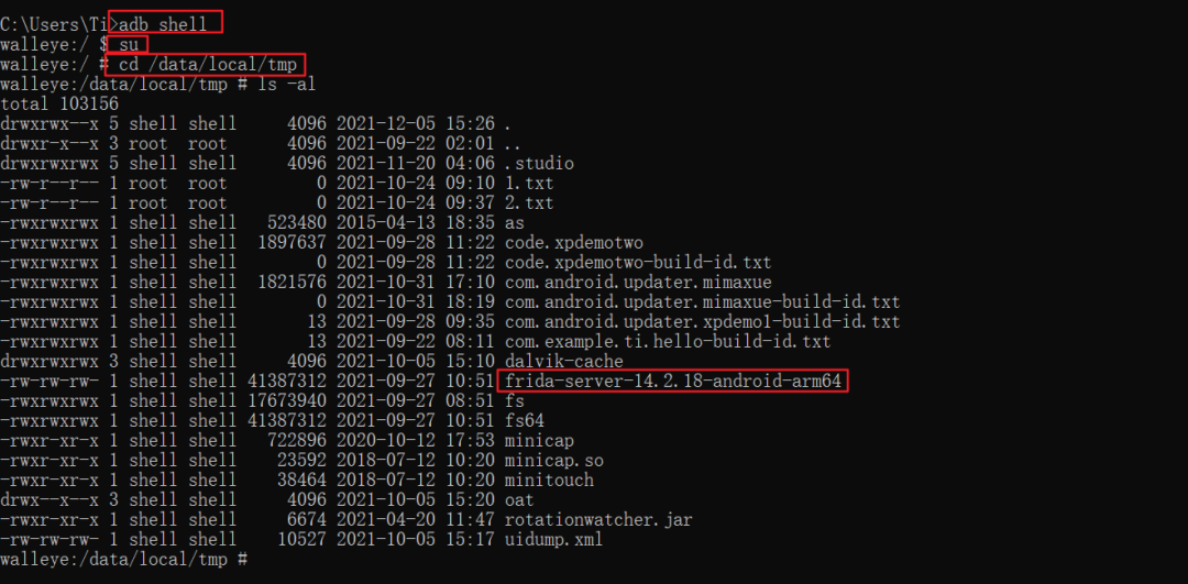 将Frida软件安装至手机后,需检查手机中的data/local/tmp文件夹内是否有Frida文件。若找到该文件,即表明推送操作已完成。随后,需赋予该文件复制权限并启动它。尽管没有显示等待提示,但事实上它正等待执行。