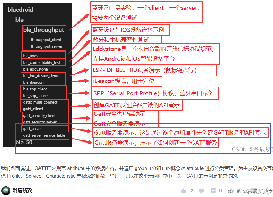 实际情况是,我查看了相关资料,了解到应用开发者通常使用GAT、GATT和ATT的示例。我还花了大量时间去阅读每个示例工程的详细说明,并对照注释挑选出了两个较为合适的示例。这是一个不断探索的过程,需要在众多选项中根据自己的需求和认识做出选择。