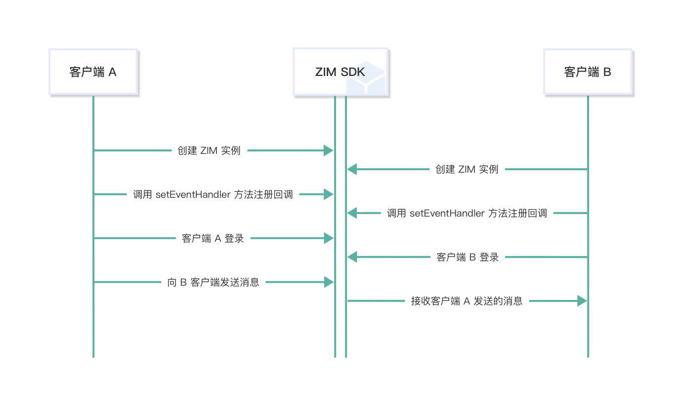 在SDK里构建ZIM实例,这等于是以用户身份作为客户端接入系统。每个实例都对应一个用户。就像客户端A和B那样,通过调用相应接口,并传入获取的AppID来分别建立各自的实例。特别留意ZIM不同版本在鉴权方面的差异,比如从2.3.0版起支持特定鉴权,2.3.3及以上版本能自主选择鉴权方式,而2.3.0到2.3.1版本若需更改鉴权方式,则需与技术支持取得联系。