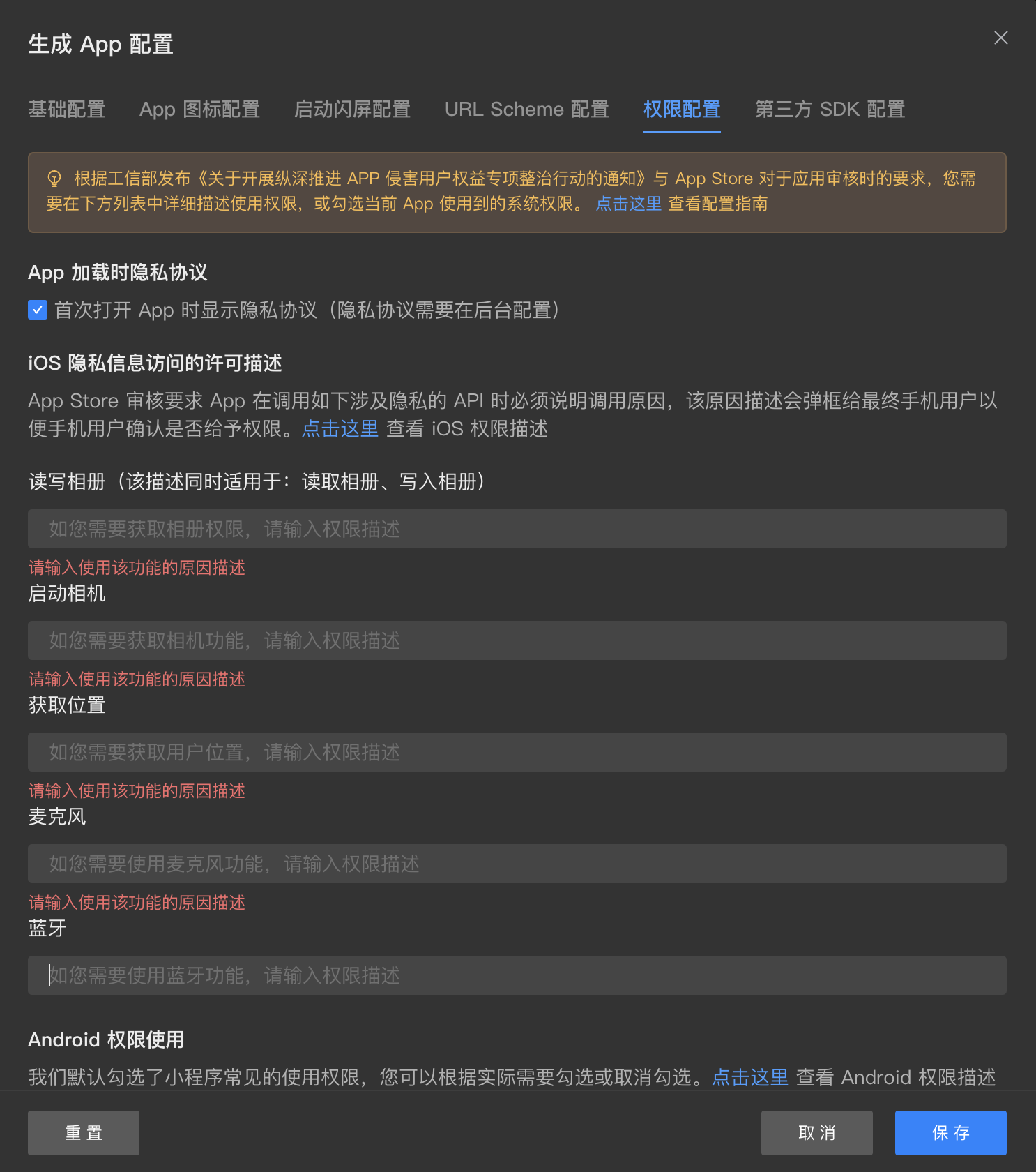 开启闪屏、网址、权限等功能,用户还可自行设定。在设置权限时,若计划将应用上架至应用商店,iOS平台的权限需具体说明用途或目的。启动闪屏则是指App启动时显示的加载画面,用户需上传符合平台要求的尺寸,同时具备吸引力的图片。