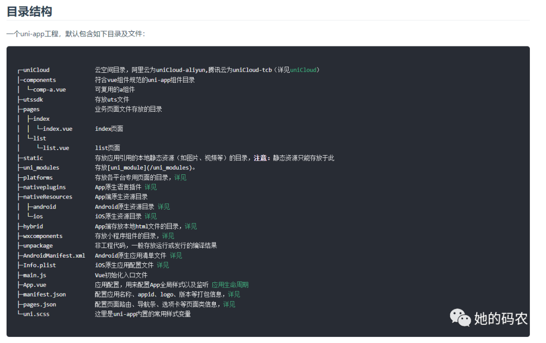 项目一旦创建成功,左侧界面便显现出项目架构。架构中各文件夹的作用可能不够清晰,这时查阅uni-app的官方文档就十分必要,文档对各个部分的功能进行了详尽的阐述。