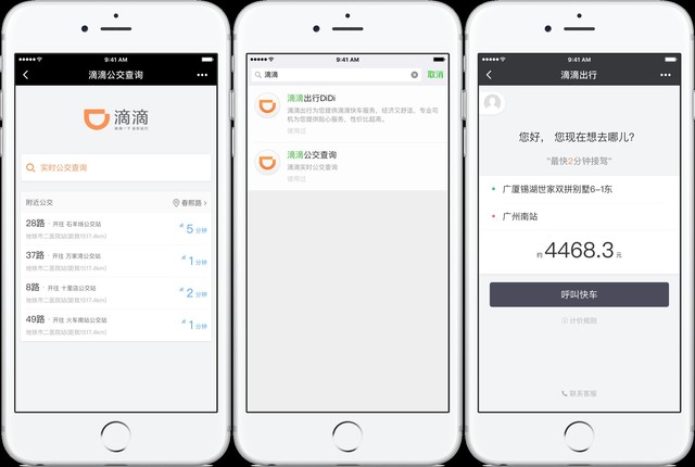 滴滴出行的小程序值得一观。对于上班族来说,每天上下班都挺累的。出了地铁站,如果没有自行车只能打车,那也不用再在桌面上找app了。在小程序里,可以直接使用快车服务,还能管理账户。更重要的是,里面没有启动广告,这让整个使用体验变得更好。