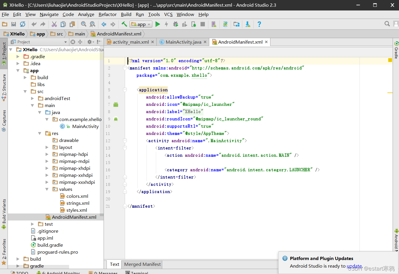 res下面我们放了一些资源文件,drawable下面我们可以放一些图片和自定义的xml文件,layout主要是放置一些具体的布局文件,mipmap可以放一些logo图片,在values中,我们可以放一些我们app中文字的颜色,样式,类型等等;