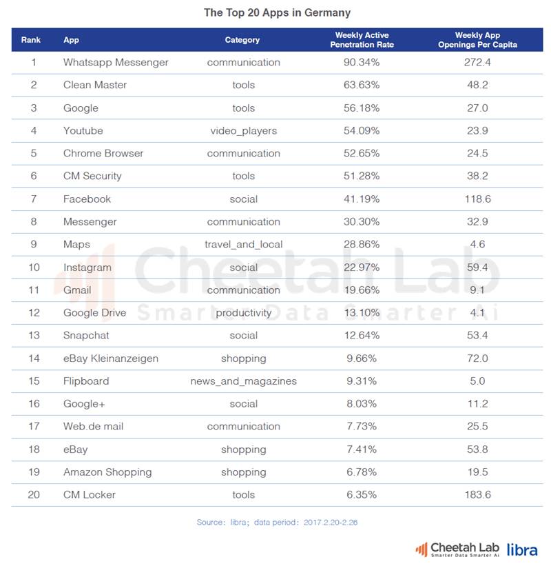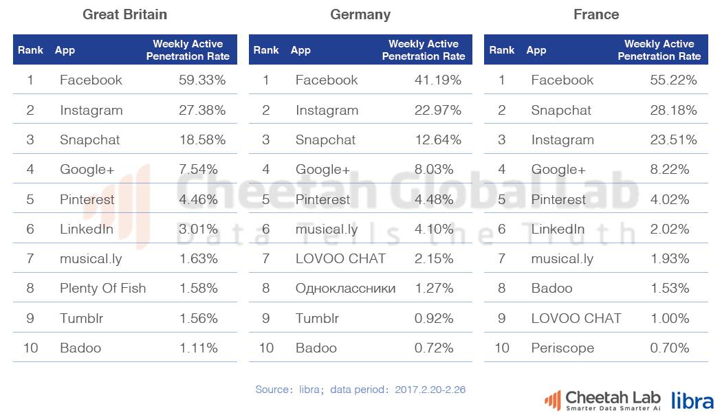 英国、德国、法国的社交应用排行榜前十名中,美国企业的产品占据了前五的位置,表现突出。而本土企业的表现普遍不佳。这可能是因为本土企业未能及时预见到社交功能的新趋势,也可能是因为它们在推广资金上的不足。另外,在社交创新领域,它们似乎也与美国企业存在一定的差距。