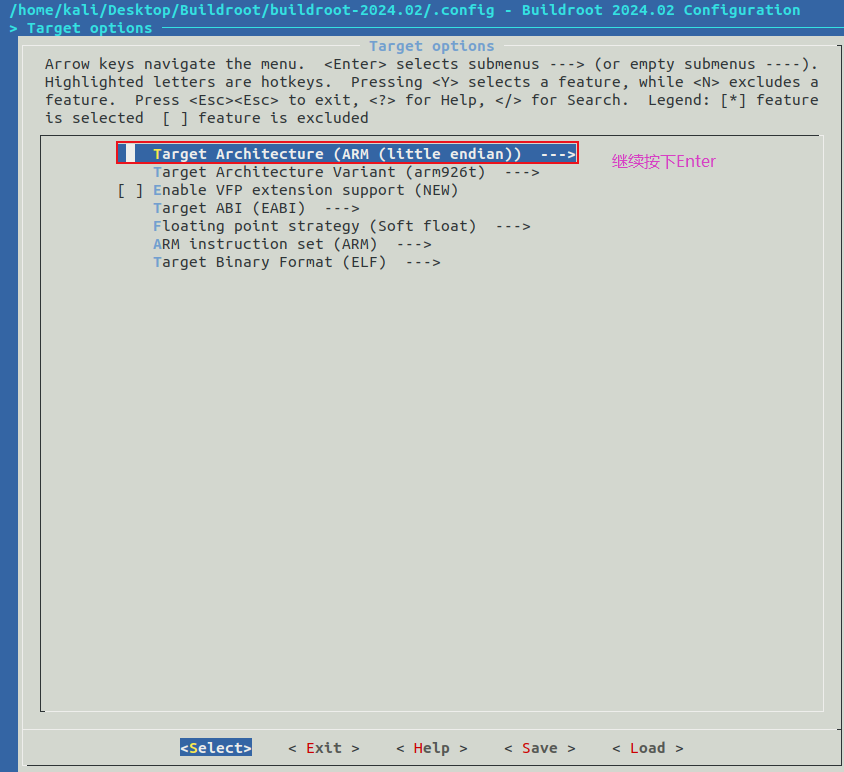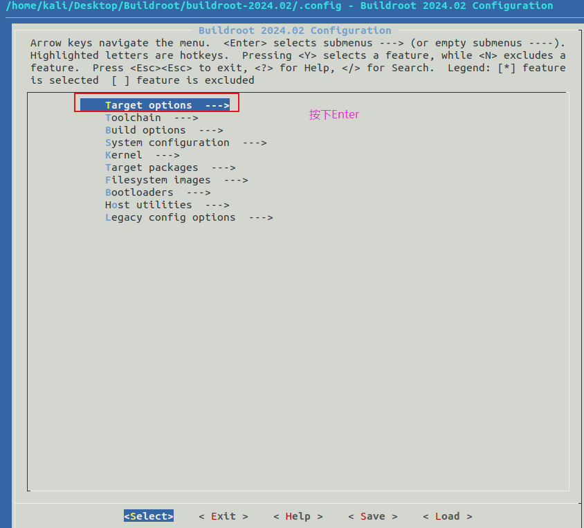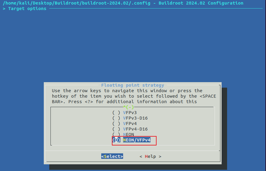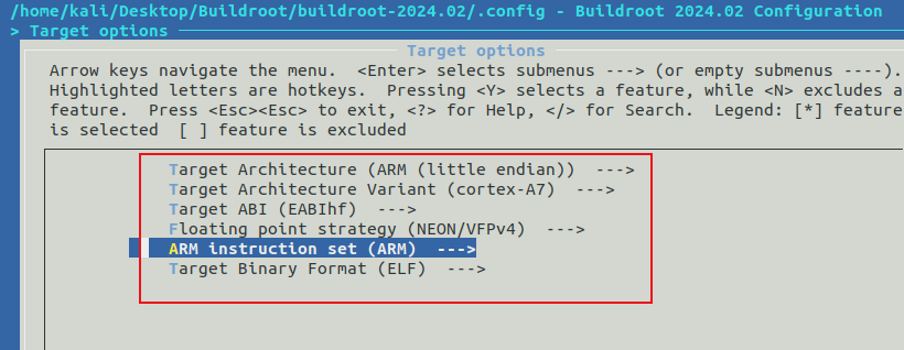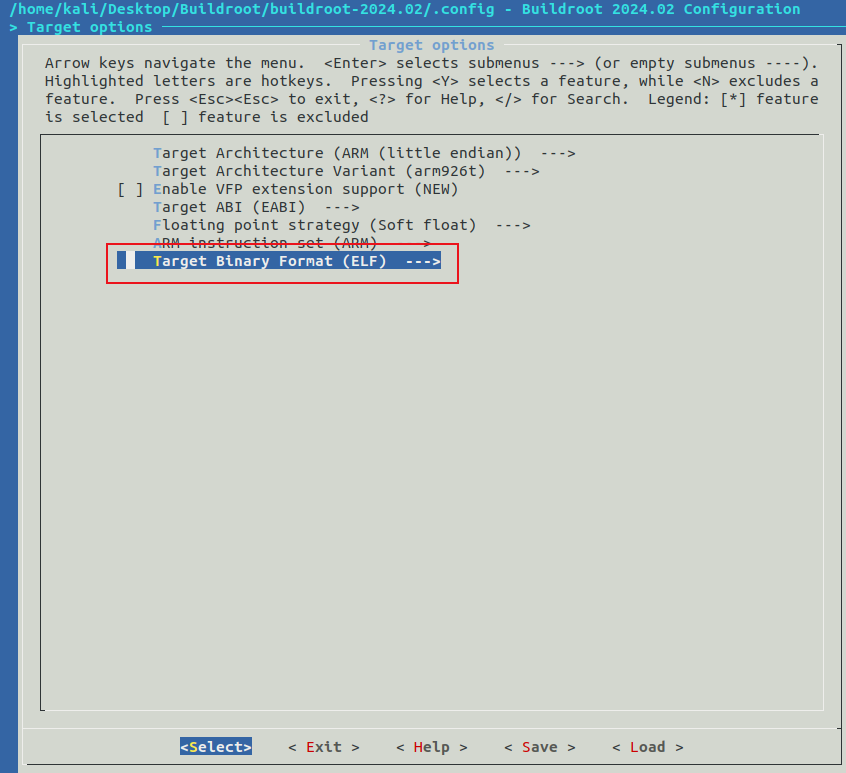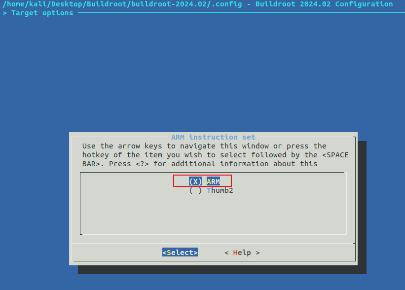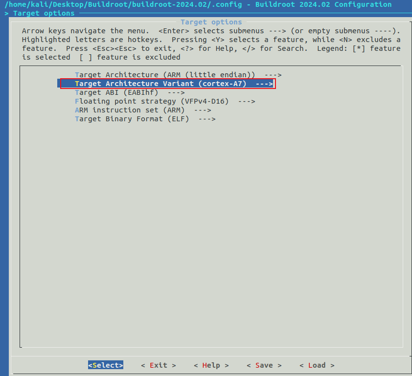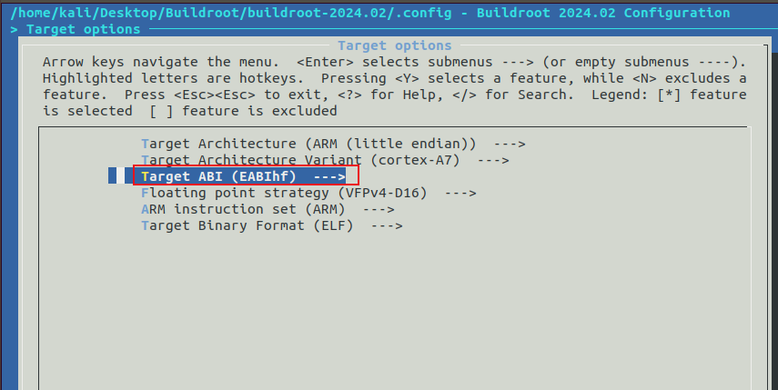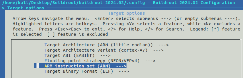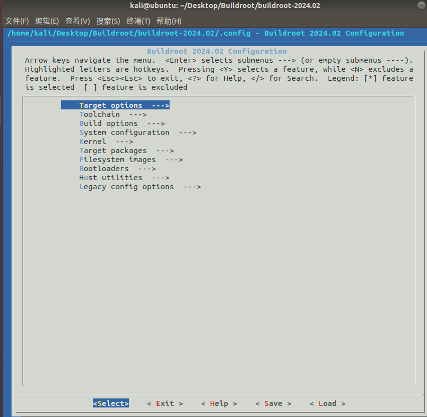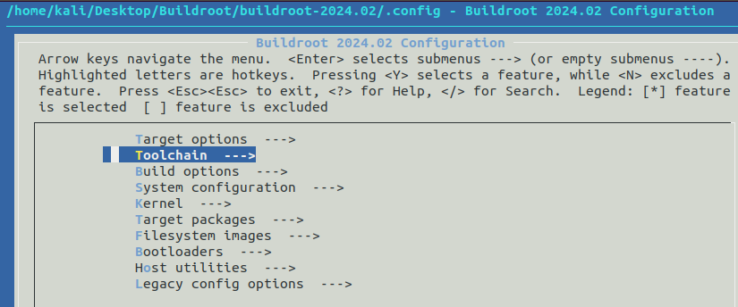 kali@ubuntu:~/Desktop/Buildroot$ cd buildroot-2024.02/kali@ubuntu:~/Desktop/Buildroot/buildroot-2024.02$ make menuconfig
