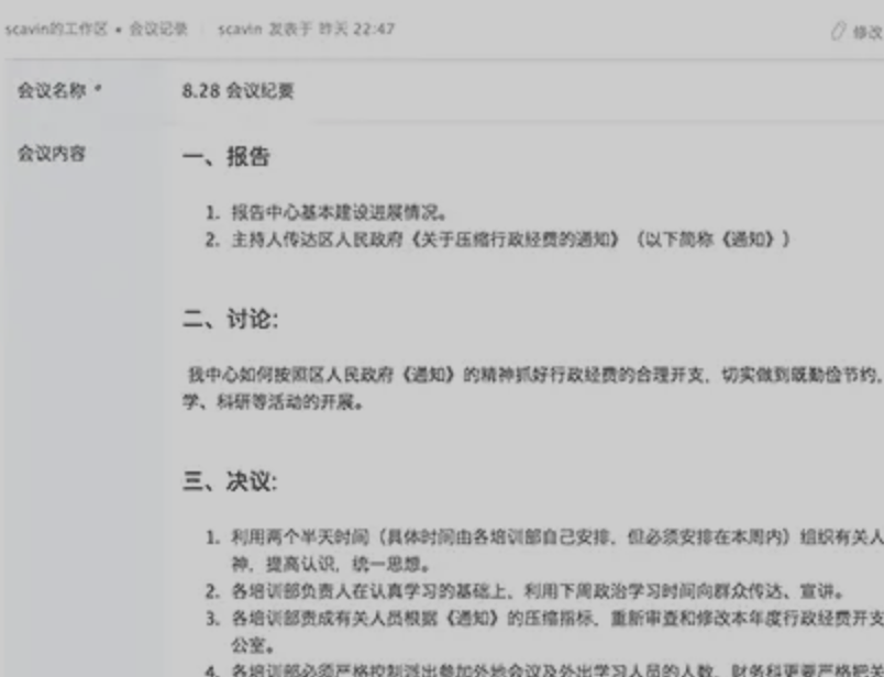 伙伴云表格种类丰富。它不仅包括客户资料、员工名单等纯表格文档,还能处理会议记录、知识库等传统文档内容。以会议记录为例,在伙伴云表格中,不再是简单的文字记录,而是以表格形式清晰展示。